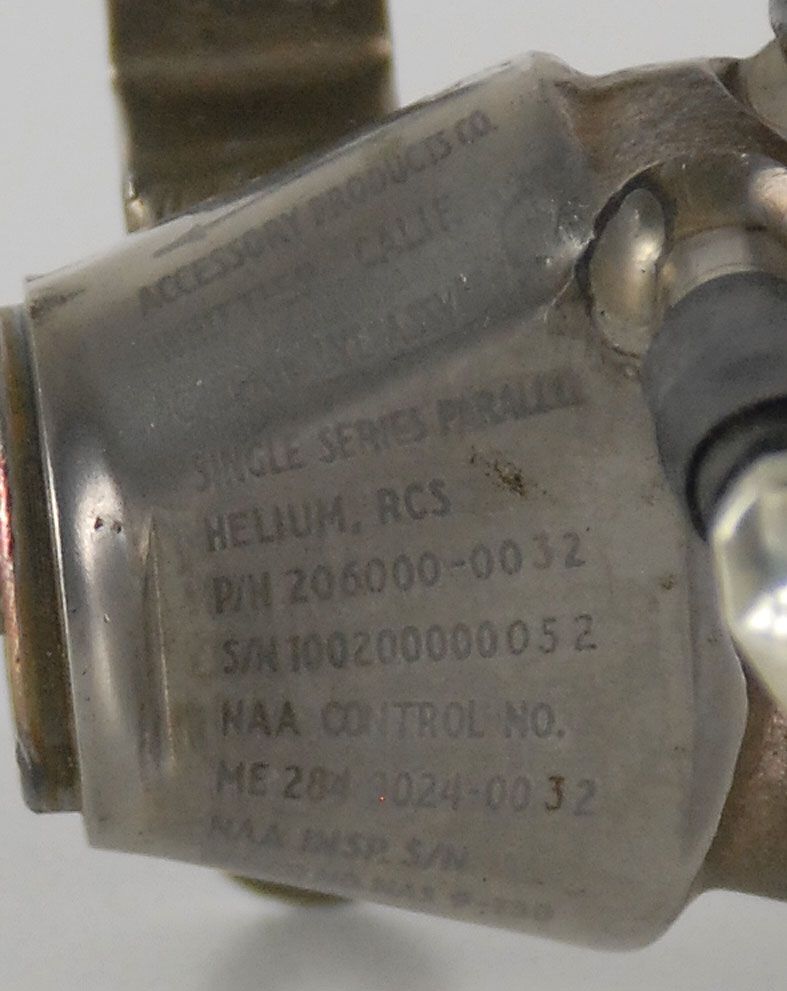 Apollo Helium RCS check valve assembly used in both the command and service modules. Lightweight check valve assembly for the Reaction Control System measures approximately 4.5? long. Data stamped on the part indicates it was made by Accessory Products Company under order number NAS9-150, which was the NASA contract number of North American Aviation, which built the command module. Accompanied by its Accessory Products paperwork indicating that the part was made on September 6, 1964. In fine condition.