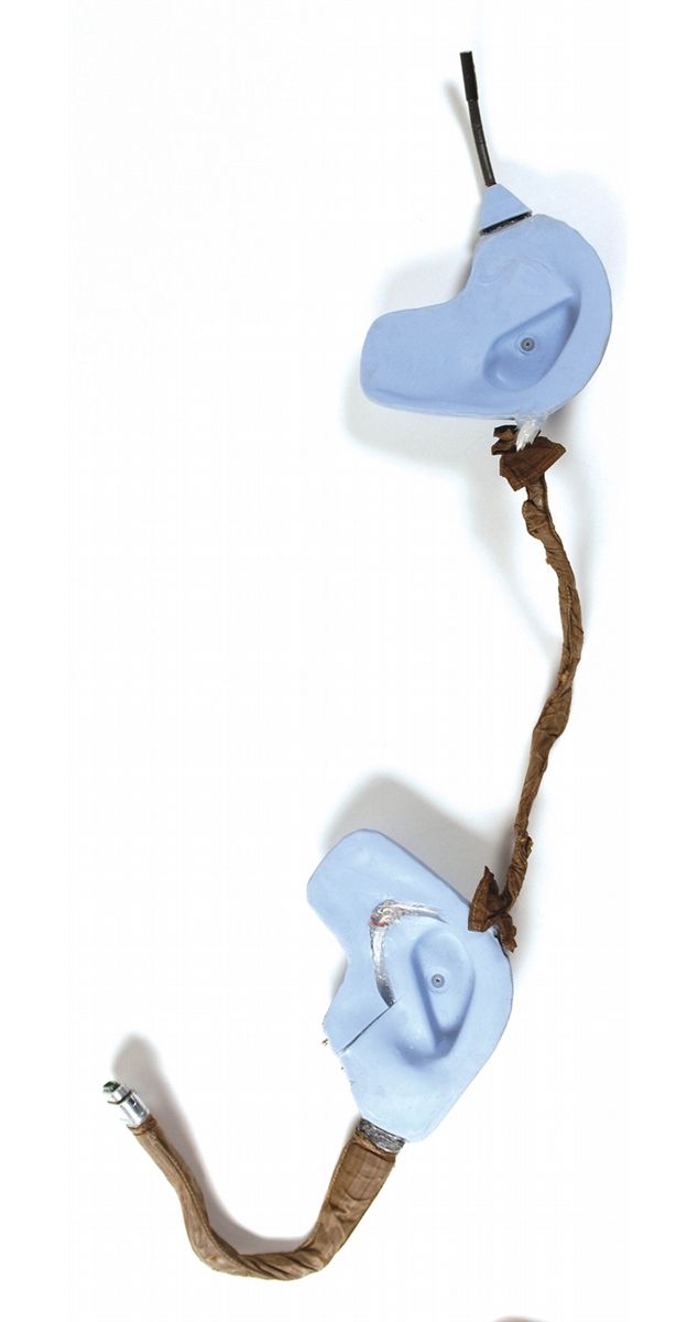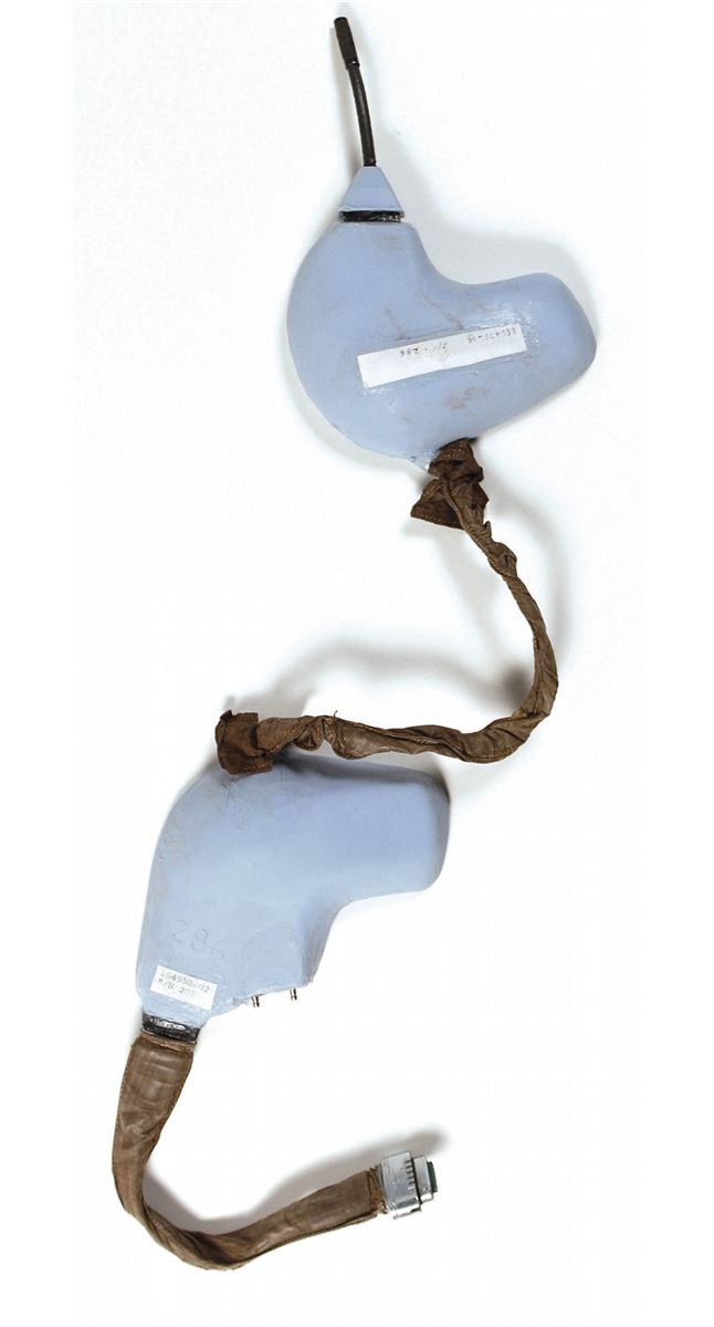 An Apollo-era Communications Carrier Electronic Module(CCEM), Part No. 16495G-02, S/N 286. This module is the hardware component of the Communications Carrier Assembly, more commonly known as the ‘Snoopy Cap.’ It consists of earphones and microphones for both the right side and the left side. The two sides are joined with a 10.5? wiring harness. In addition the right side has a wiring harness with a connector at the end for connecting to the spacecraft umbilical cable. The electronics for the earphones and microphones are contained within blue molded rubber enclosures, with molded recesses for the earphones. These rubber enclosures would be held in place over the astronaut's ears while wearing the ‘Snoopy Cap’. The wire harnesses are covered with Teflon fabric, which is the same fabric used for the ‘Snoopy Cap.’ In fine condition, with unit missing the right side microphone boom, and right side earphone rubber has been cut for a repair, and then sealed again.