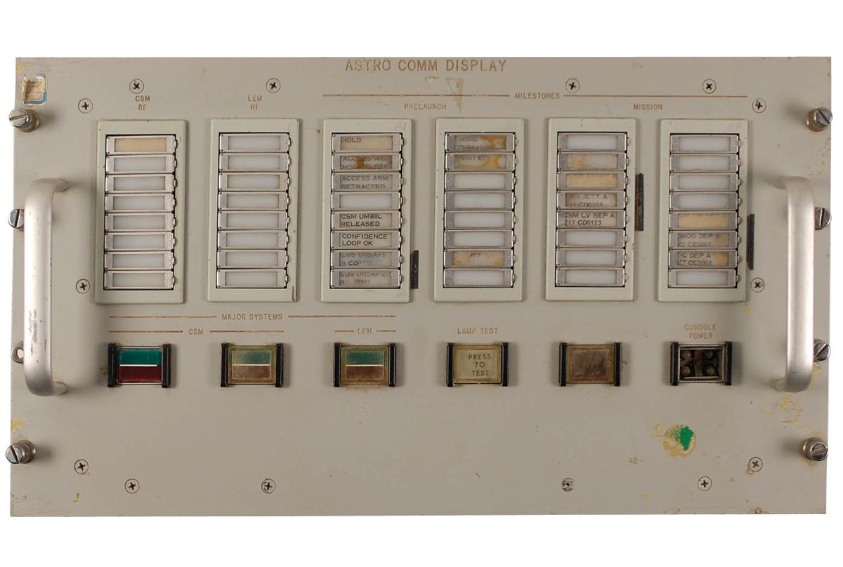 Apollo Astro Comm Display control panel. stamped on the reverse with a Ge assembly number, measuring 10.5 x 19 x 6. Panel is headed at the top, “Astro Comm Display,” with six rows of eight indicator lights, with 16 lights labeled, including “Access Arm Retracted,” “Firing Command,” and “Ignition.” Rows of lights are designated for the CSM, LEM, and Prelaunch and Mission Milestones, and five buttons at the bottom, with a sixth button missing. In overall very good condition.