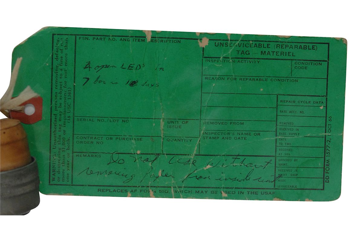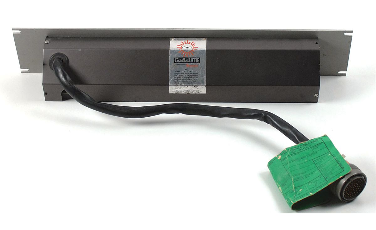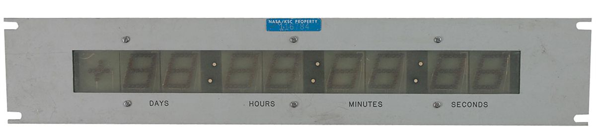 NASA Apollo-era countdown clock. Digital countdown clock measures 19 x 3.5 x 3, and displays the countdown in days, hours, minutes, and seconds and is complete with its umbilical cable. Front also bears a NASA/KSC Property label, numbered “116784.” A green DD Form 1577-2 Unserviceable tag is tied to the cable. This clock would have been used in the Launch Control Center at Cape Canaveral. In fine condition.