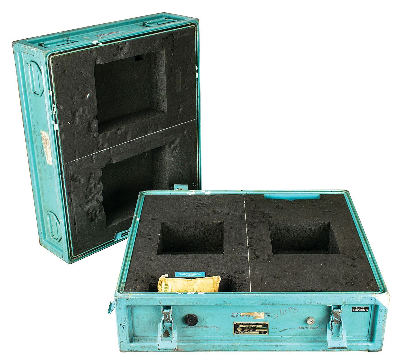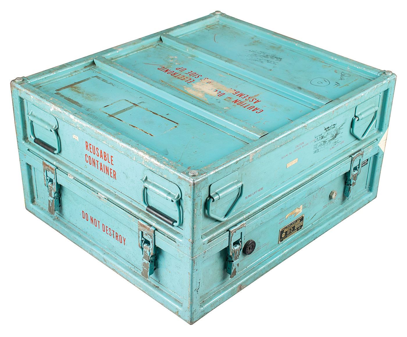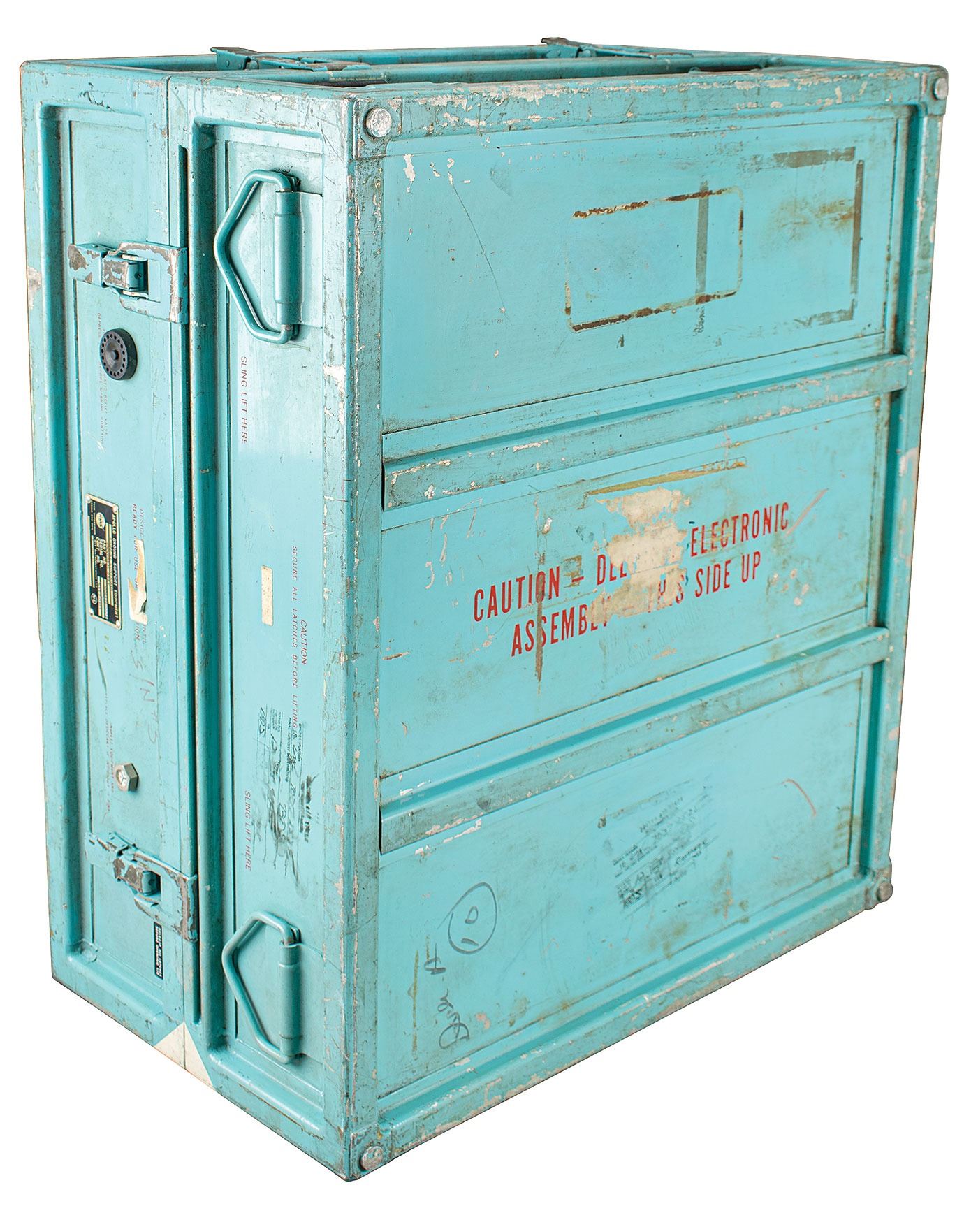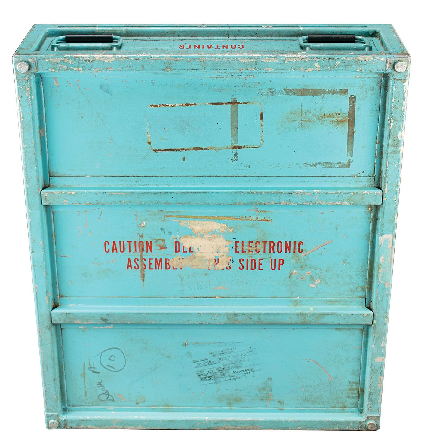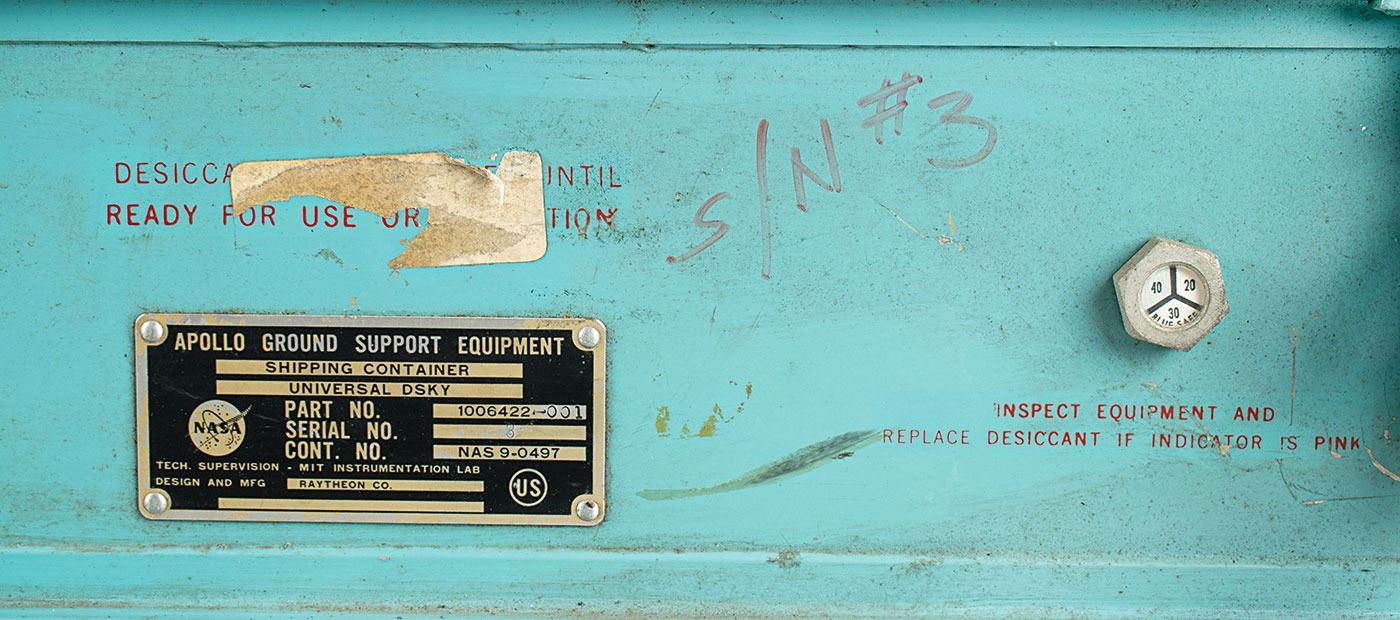 Huge original Apollo Display and Keyboard (DSKY) transit case painted in 'Apollo Blue,' measuring 31.75? x 17? x 27?, with a NASA parts plaque on the top: "Apollo Ground Support Equipment, Shipping Container, Universal DSKY, Part No. 1006422-001, Serial No. 3, Cont. No. NAS 9-0497, Tech. Supervision - MIT Instrumentation Lab, Design and MFG Raytheon Co." The same panel has a valve marked in red, "Two-way automatic relief valve, depress core before opening container," and a moisture meter marked in red, "Inspect equipment and replace desiccant if indicator is pink." The exterior also bears transit stamps indicating LAX to BOS (possibly Raytheon to MIT). The interior is lined with thick black form-fitting foam with cutouts for two DSKYs, as well as two large desiccant pouches. Affixed inside is a Zero manufacturer's tag, stamp-dated December 30, 1965. In very good condition, with scuffing and chipping to paint, and some losses to the interior foam.