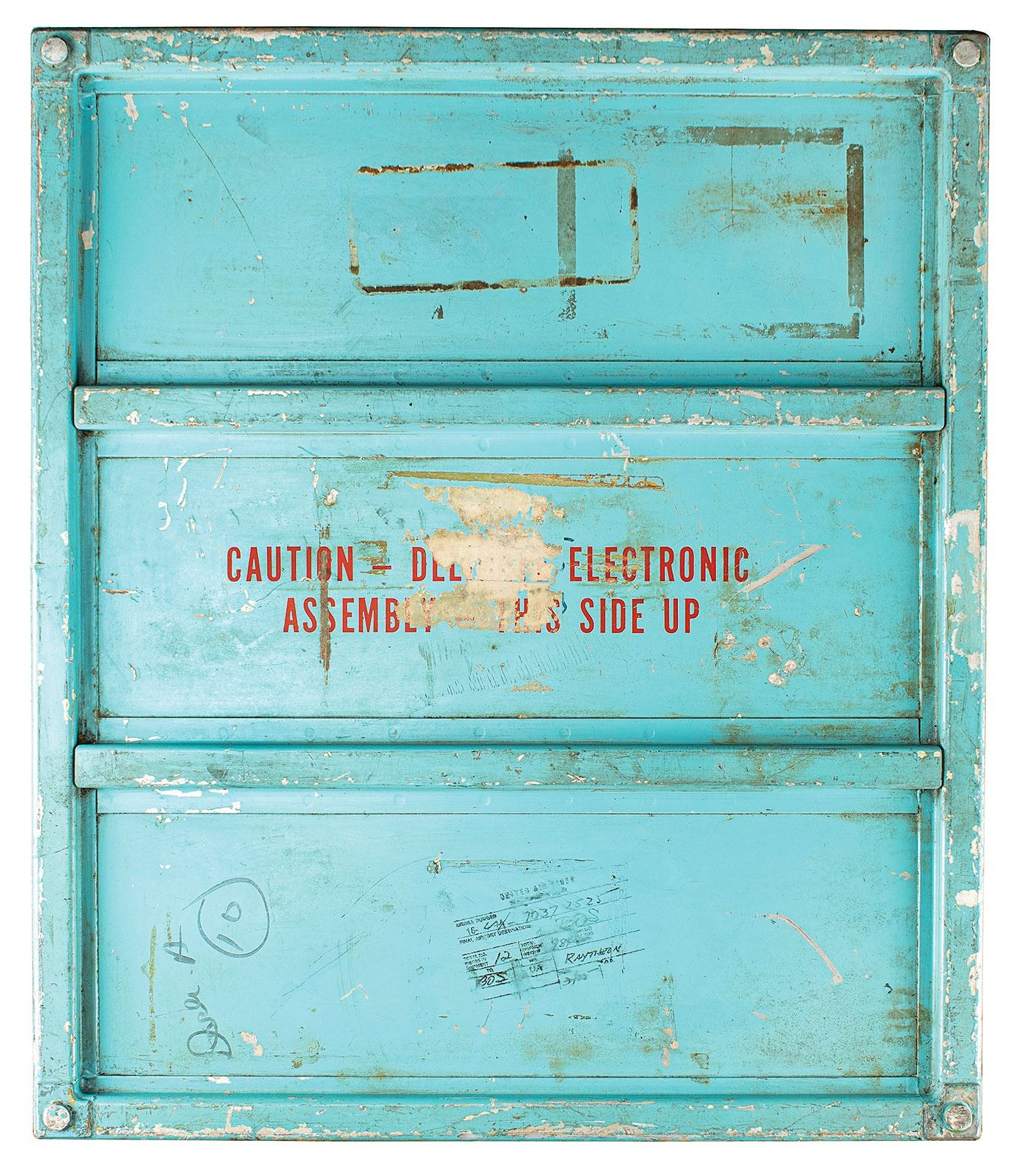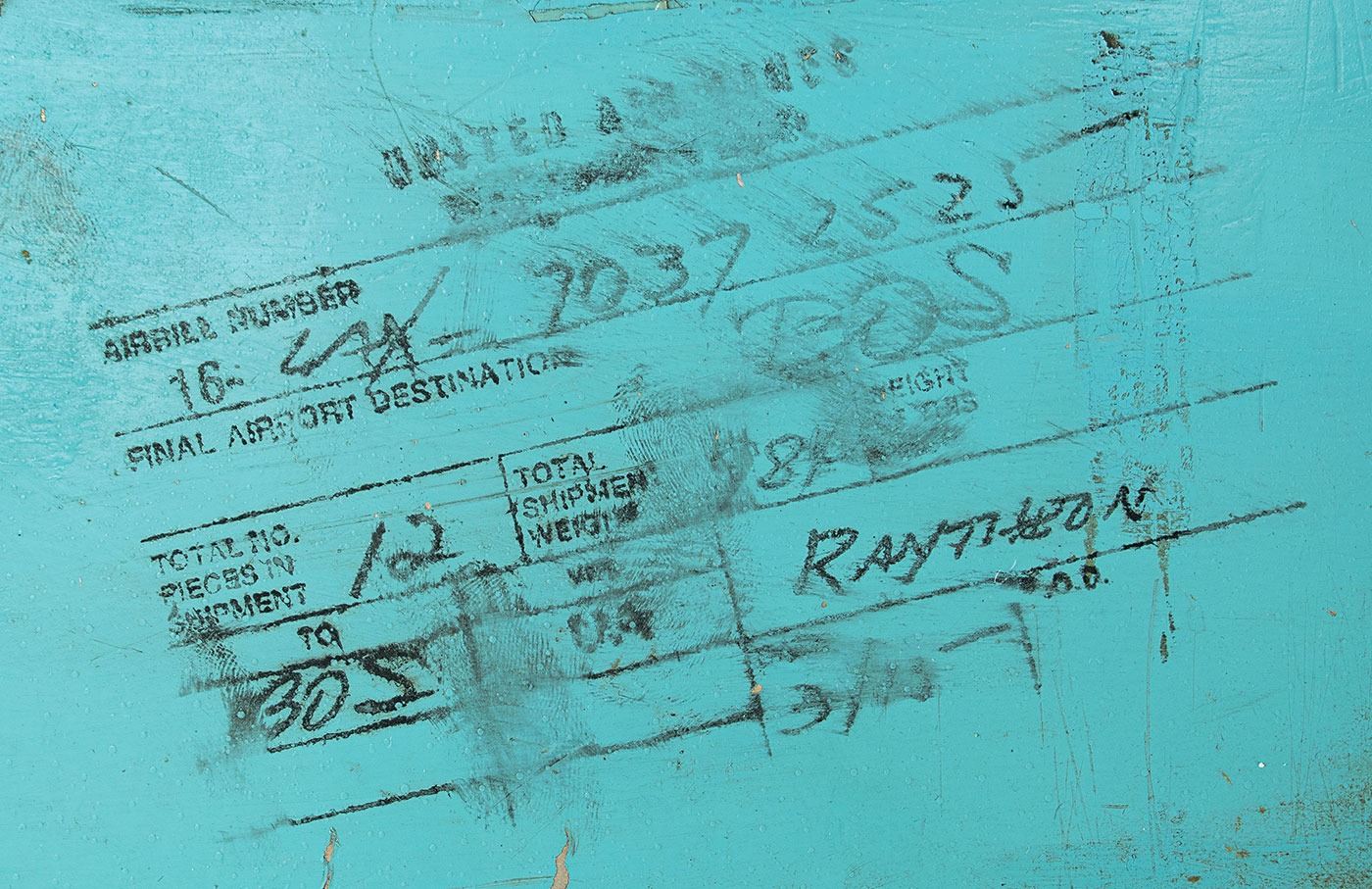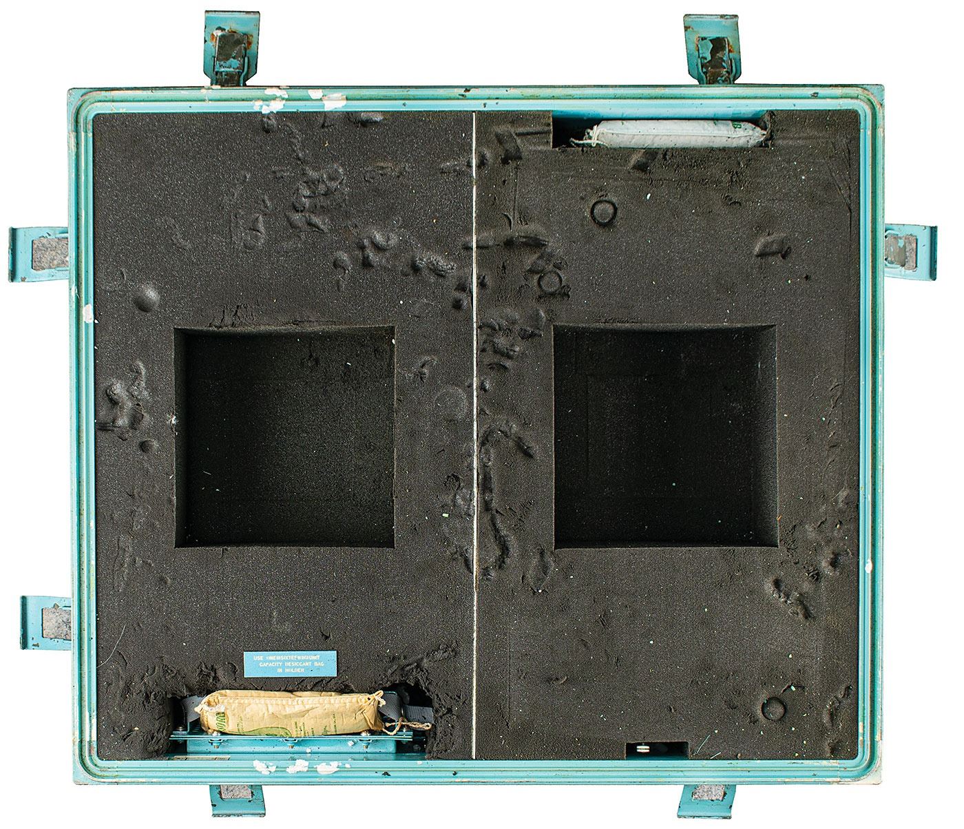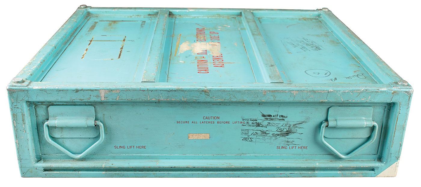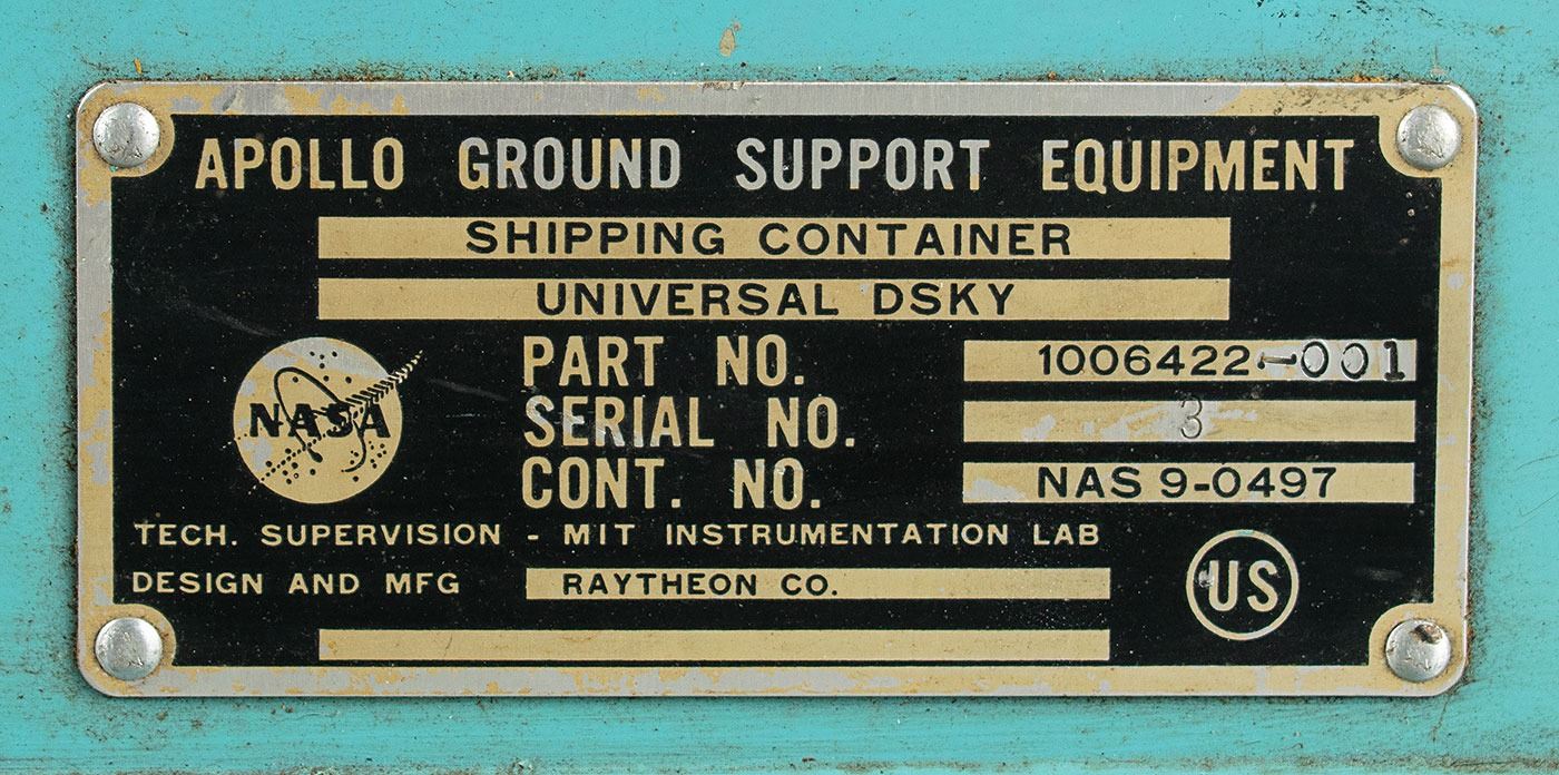 Huge original Apollo Display and Keyboard (DSKY) transit case painted in 'Apollo Blue,' measuring 31.75? x 17? x 27?, with a NASA parts plaque on the top: "Apollo Ground Support Equipment, Shipping Container, Universal DSKY, Part No. 1006422-001, Serial No. 3, Cont. No. NAS 9-0497, Tech. Supervision - MIT Instrumentation Lab, Design and MFG Raytheon Co." The same panel has a valve marked in red, "Two-way automatic relief valve, depress core before opening container," and a moisture meter marked in red, "Inspect equipment and replace desiccant if indicator is pink." The exterior also bears transit stamps indicating LAX to BOS (possibly Raytheon to MIT). The interior is lined with thick black form-fitting foam with cutouts for two DSKYs, as well as two large desiccant pouches. Affixed inside is a Zero manufacturer's tag, stamp-dated December 30, 1965. In very good condition, with scuffing and chipping to paint, and some losses to the interior foam.