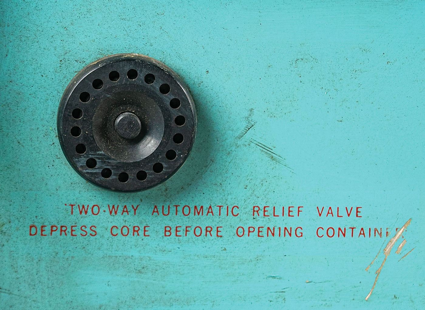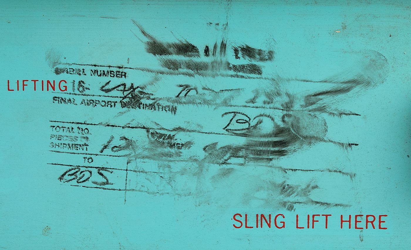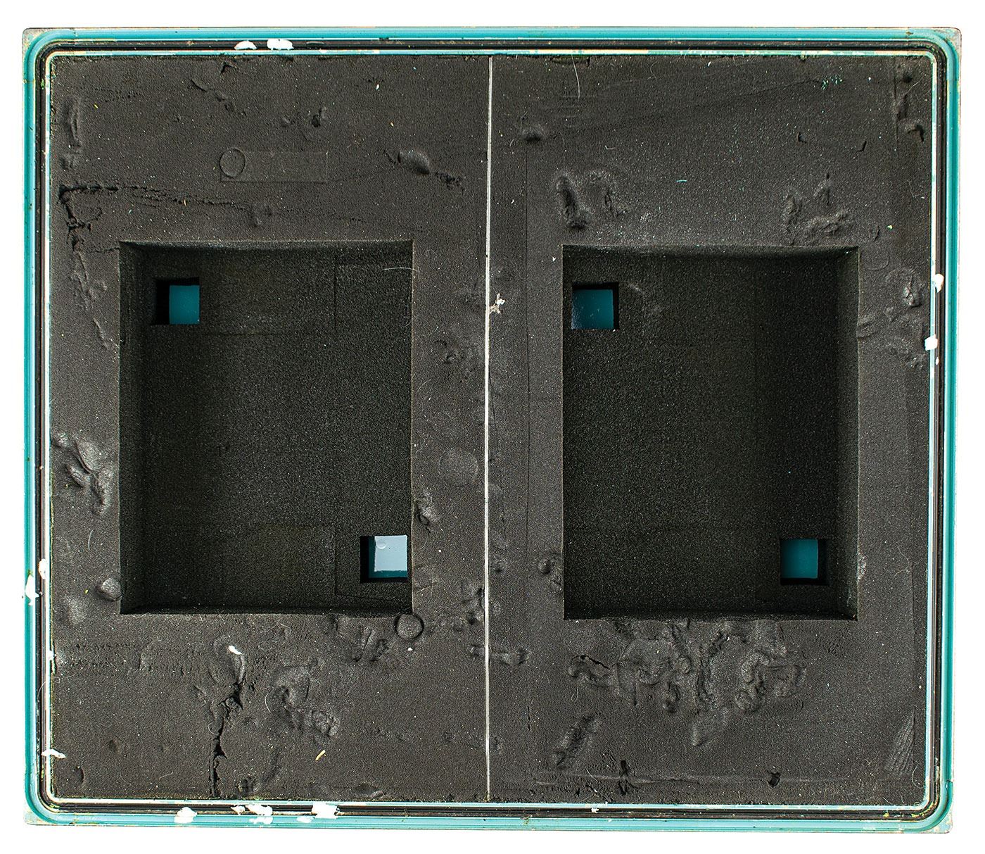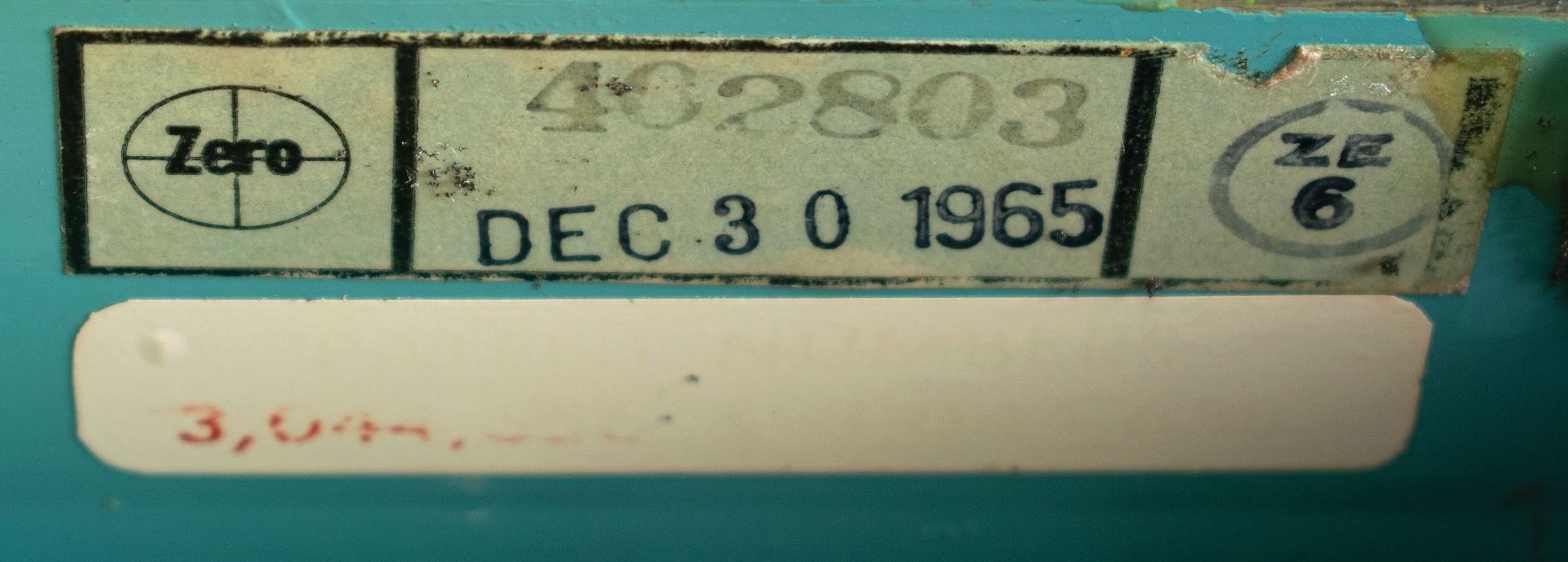 Huge original Apollo Display and Keyboard (DSKY) transit case painted in 'Apollo Blue,' measuring 31.75? x 17? x 27?, with a NASA parts plaque on the top: "Apollo Ground Support Equipment, Shipping Container, Universal DSKY, Part No. 1006422-001, Serial No. 3, Cont. No. NAS 9-0497, Tech. Supervision - MIT Instrumentation Lab, Design and MFG Raytheon Co." The same panel has a valve marked in red, "Two-way automatic relief valve, depress core before opening container," and a moisture meter marked in red, "Inspect equipment and replace desiccant if indicator is pink." The exterior also bears transit stamps indicating LAX to BOS (possibly Raytheon to MIT). The interior is lined with thick black form-fitting foam with cutouts for two DSKYs, as well as two large desiccant pouches. Affixed inside is a Zero manufacturer's tag, stamp-dated December 30, 1965. In very good condition, with scuffing and chipping to paint, and some losses to the interior foam.