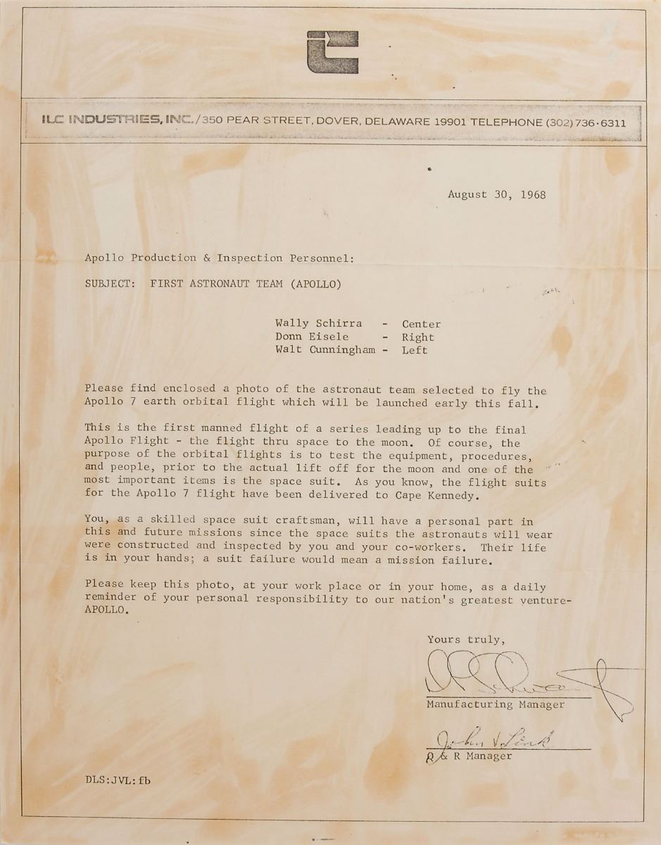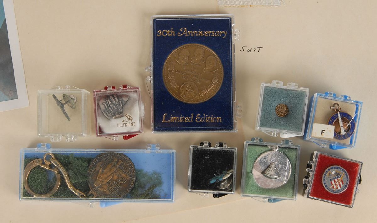 Collection of items from the collection of a longtime employee of ILC Industries in Dover, Delaware, which has developed space suits for NASA since the Apollo era, including: an official color 8 x 10 NASA lithograph of Ed Gibson, signed and inscribed in black felt tip, “Lo Puckett—Thanks for helping make our country’s space program successful—Ed Gibson,” affixed to a larger scrapbook page; a beta cloth flag patch as worn on the astronauts’ space suits affixed to a larger scrapbook page; seven pins, portraying astronauts, the Apollo 16 insignia, an Apollo capsule, and a coat of arms; an ILC industries form letter distributed to employees in 1968; a keychain honoring the first man on the moon; and a limited edition medallion honoring the 20th anniversary of Apollo 11. Also includes additional scrapbook pages featuring affixed news articles related to America’s space program. In overall very good condition.