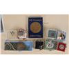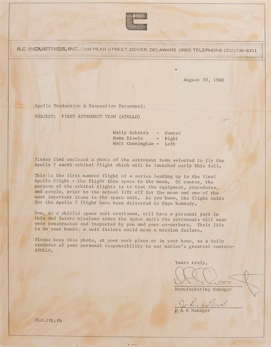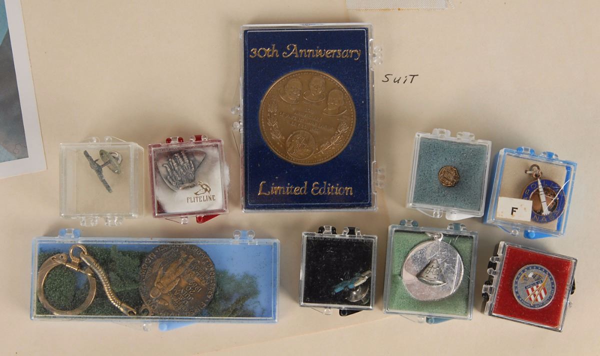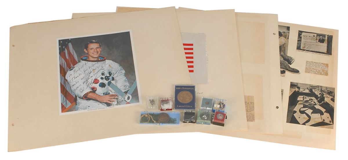 Collection of items from the collection of a longtime employee of ILC Industries in Dover, Delaware, which has developed space suits for NASA since the Apollo era, including: an official color 8 x 10 NASA lithograph of Ed Gibson, signed and inscribed in black felt tip, "Lo Puckett-Thanks for helping make our country's space program successful-Ed Gibson," affixed to a larger scrapbook page; a beta cloth flag patch as worn on the astronauts' space suits affixed to a larger scrapbook page; seven pins, portraying astronauts, the Apollo 16 insignia, an Apollo capsule, and a coat of arms; an ILC industries form letter distributed to employees in 1968; a keychain honoring the first man on the moon; and a limited edition medallion honoring the 20th anniversary of Apollo 11. Also includes additional scrapbook pages featuring affixed news articles related to America's space program. In overall very good condition. Pre-certified Zarelli Space Authentication.