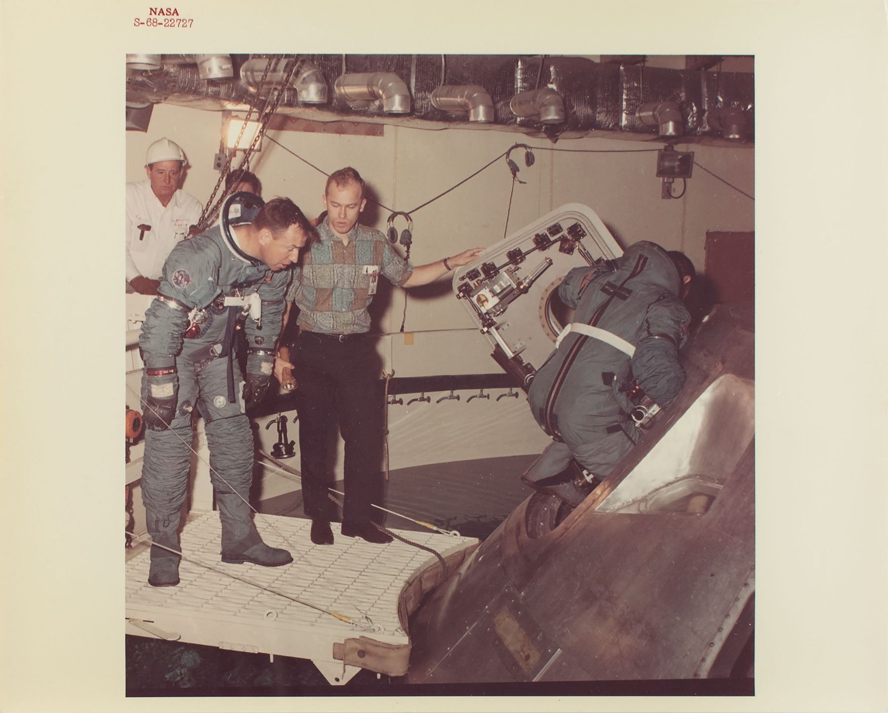 S-68-41807: Training the Apollo 7 crew with BP-1102A aboard the NASA ship MV Retriever in the Gulf of Mexico. Capt. Kruppenbacher (on right) is assisting Spacecraft Commander Wally Schirra as he enters the side hatch.
