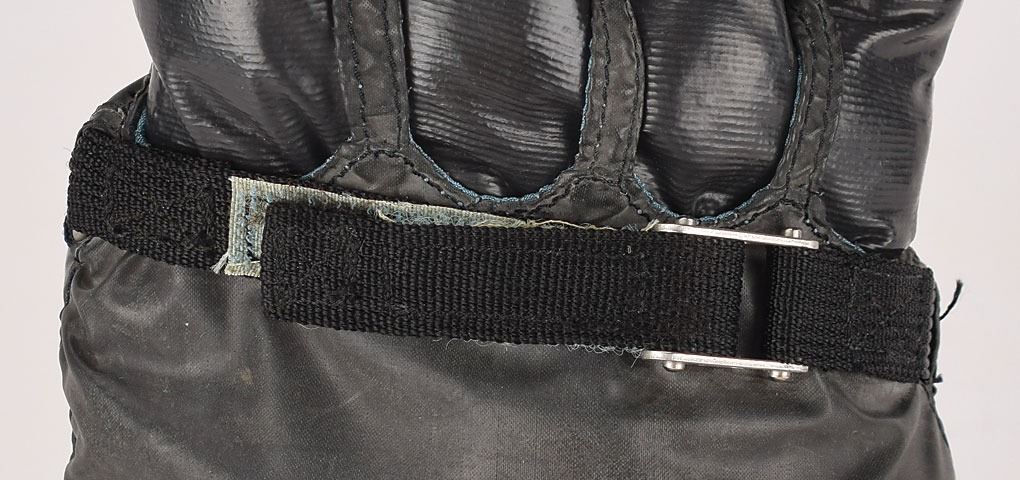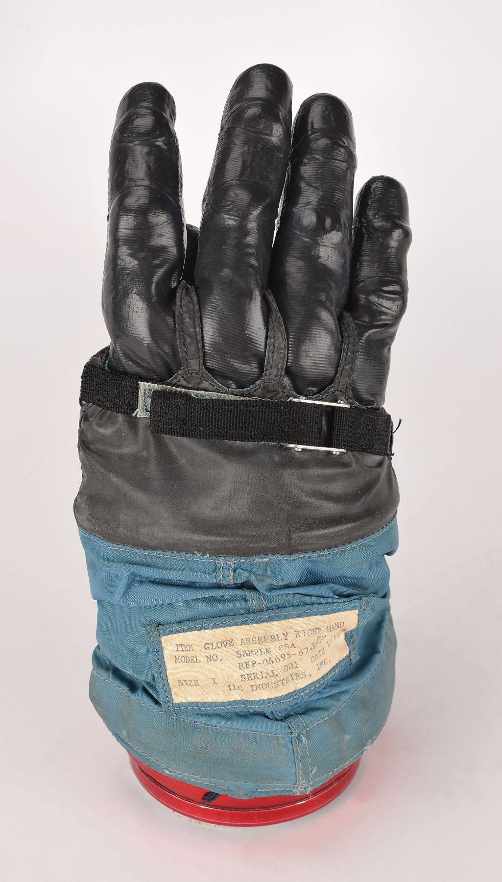 Very early right-handed A6L intravehicular glove assembly made by ILC Industries, Inc., with a wrist opening diameter of 3.25? and standing approximately 9.5? in height. The glove is constructed of a rubber/neoprene-compound bladder, dip molded with the backside of hand near wrist section featuring a sewn-on manufacturer’s label: “Item Glove Assembly Right Hand, Model No. Sample PSA, REP–04695–67–R–0050, Size I, Serial 001, Date 12/66, ILC Industries, Inc.” A fingerless glove restraint designed to maintain the glove's shape is attached to the bladder at the wrist and encloses the entire hand excluding the fingers and thumb, and the interior features a convoluted wrist section for ease of movement and a red anodized aluminum connector for attachment to the space suit, with the connector marked: “Assy 9056, SN–222, Assy A6L–103002–02.” In fine condition, with expected signs of use. From the collection of a member of the engineering and design team at ILC Industries in Dover, Delaware, from 1964 to 1972.