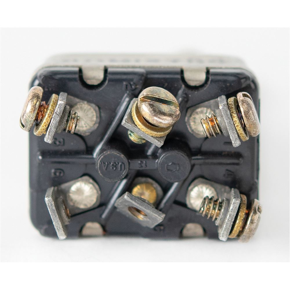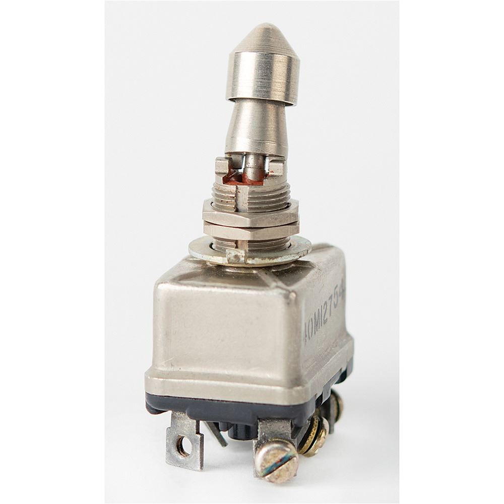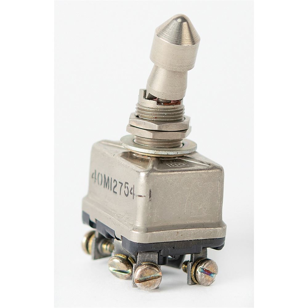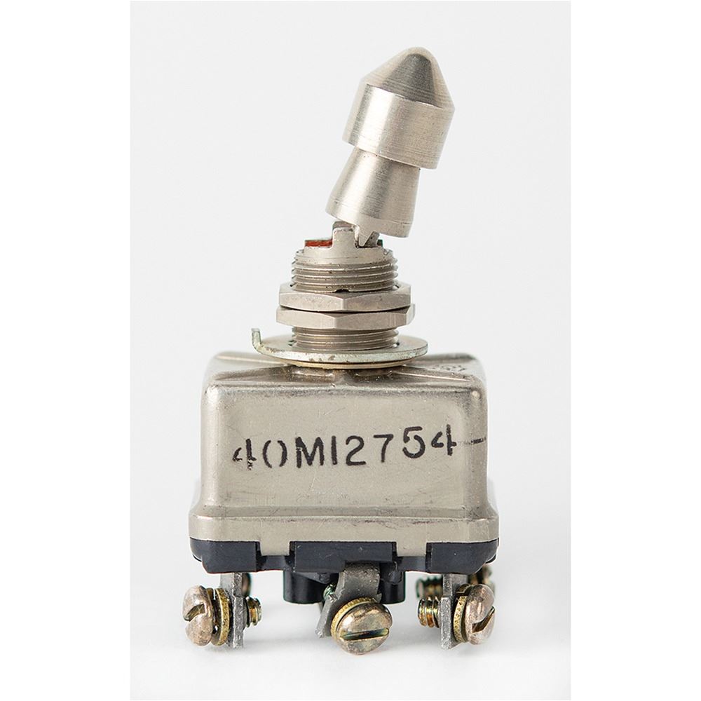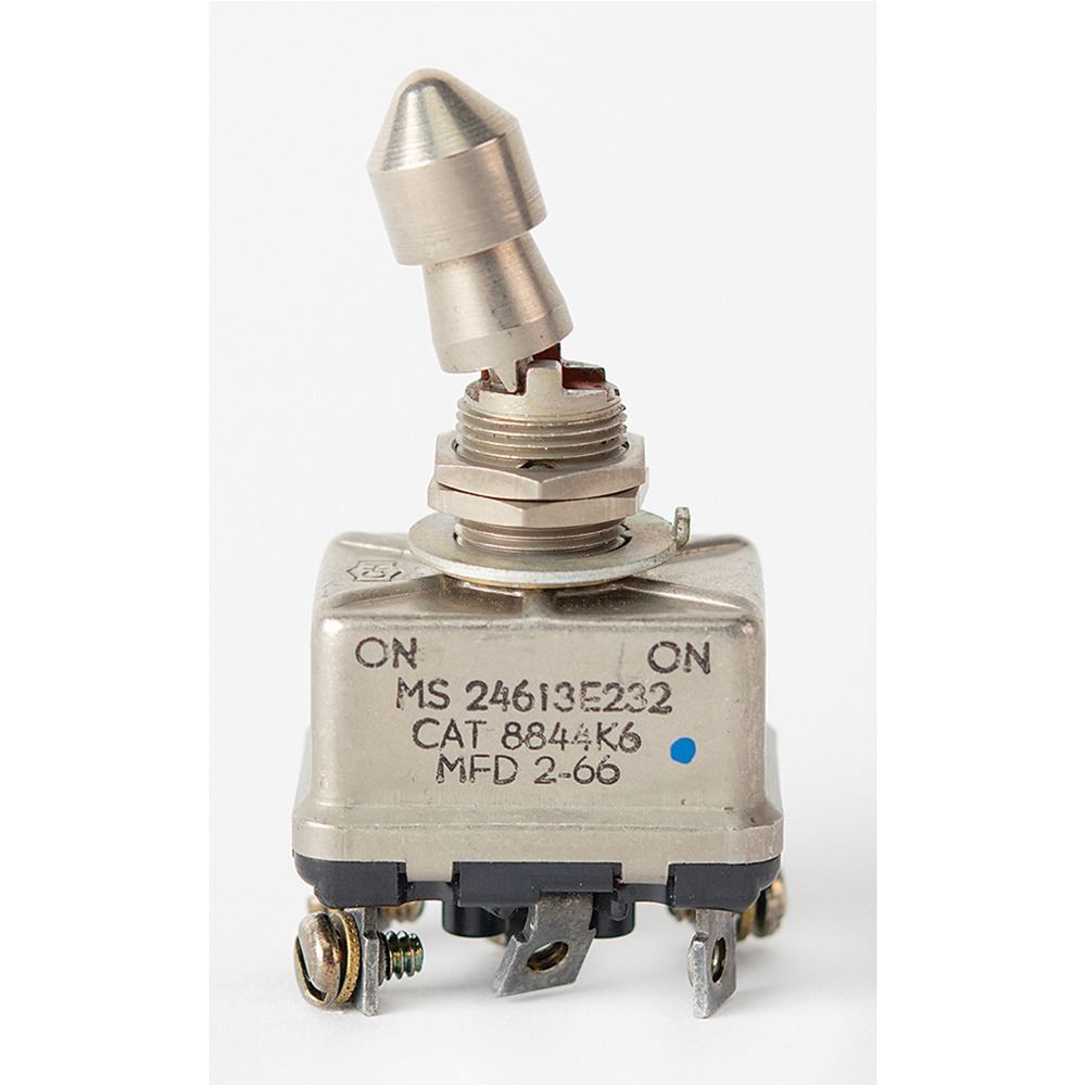 Apollo Era Affiliated two-position toggle switch produced for an identified Marshall Space Flight Center (MSFC) application, measuring 2.5Ë x 1.25Ë x 1Ë, with opposite sides labeled: "40M12754" and "On / On, MS 24613E232, CAT 8844K6, Mfd 2-66." The switch is activated first by pulling the lever, then pushing up or down. In fine condition.