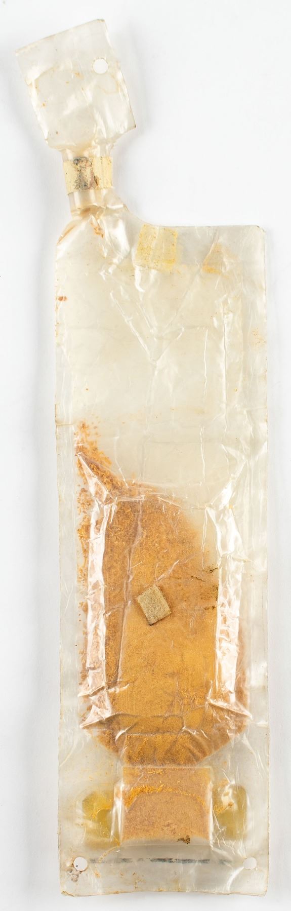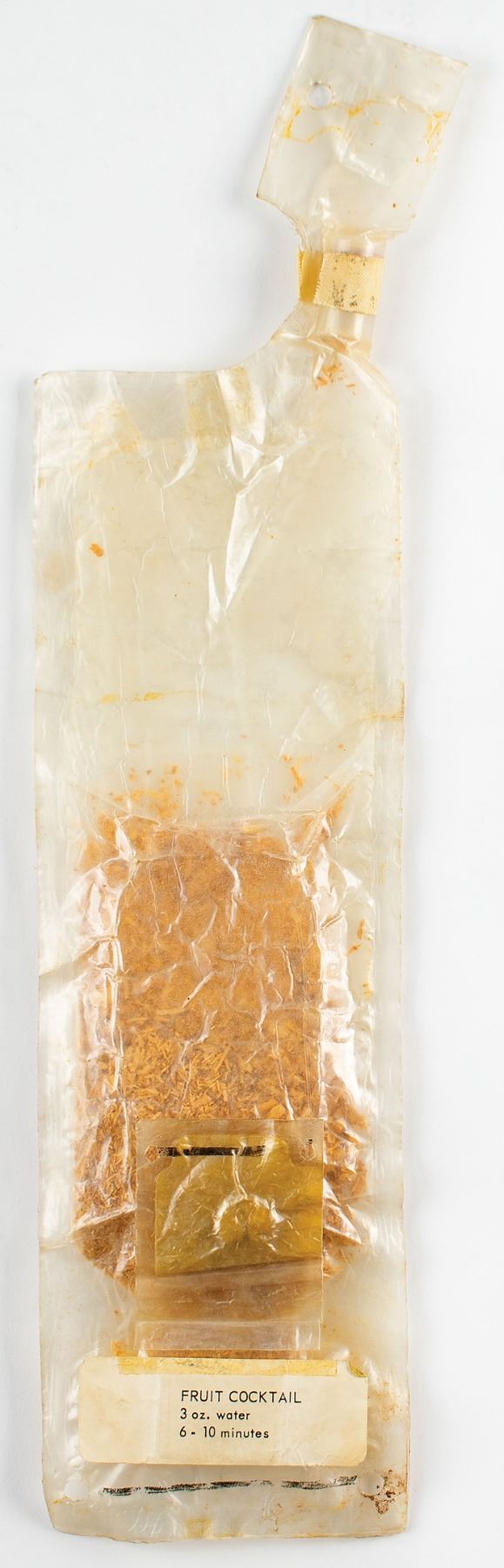 Apollo-era spacefood package containing a freeze-dried fruit cocktail drink mix, 3.5˝ x 14.5˝ x .5˝, labeled on the front: "Fruit Cocktail, 3 oz. water, 6-10 minutes." In very good to fine condition.
