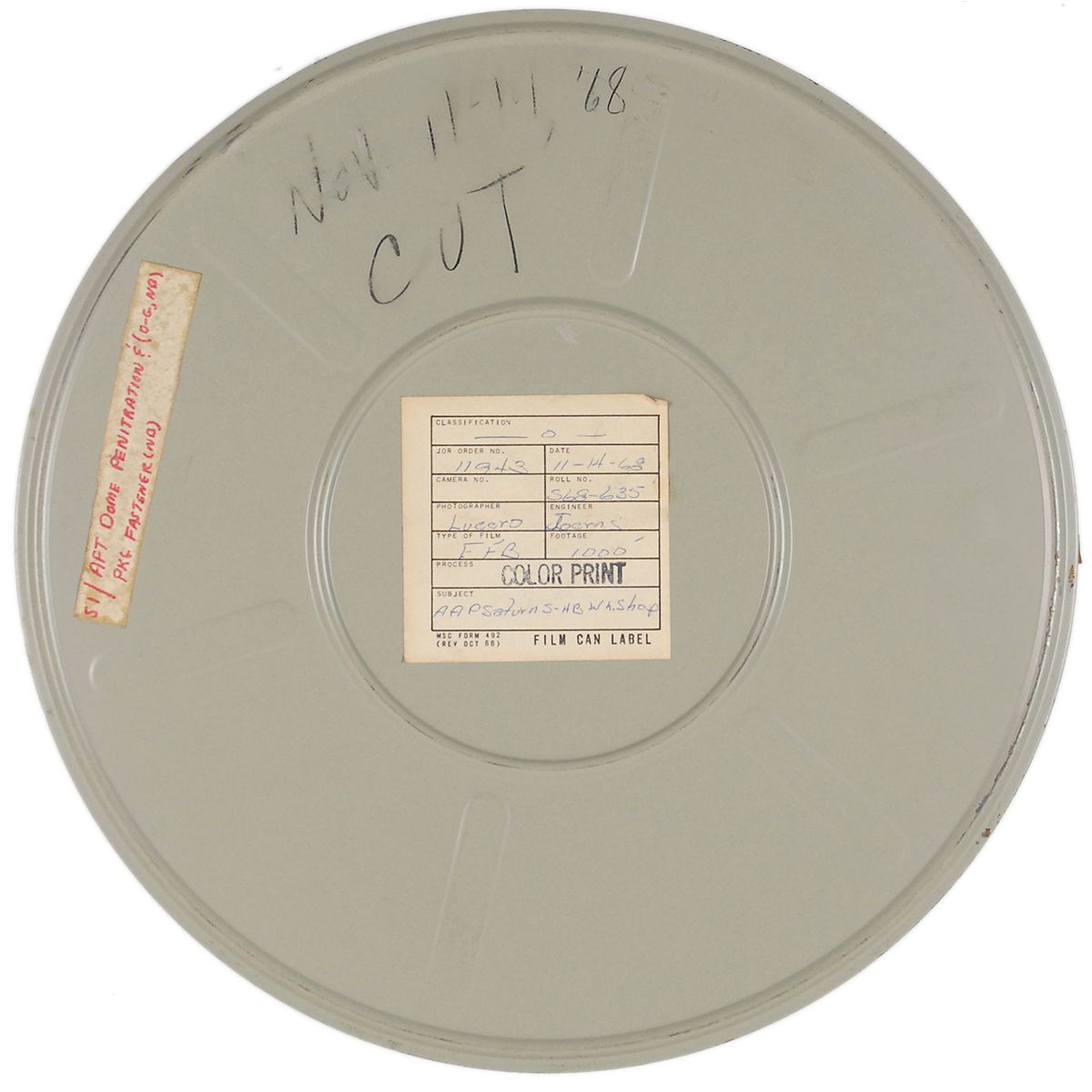 Original canister of film from the Apollo program. Canister measures 12.5? in diameter, and contains one reel of color film (unknown if sound or silent). MSC film can label affixed to the cover reads, in part: “AAP Saturn S-HB WA Shop.,” and is dated November 14, 1968. Film is 1,000 feet in length, and has a handwritten label affixed to the cover which reads, “SI/Aft Dome Penitration [sic] & (O-G, NB), Pkg Fastner (NB).” In fine condition.
