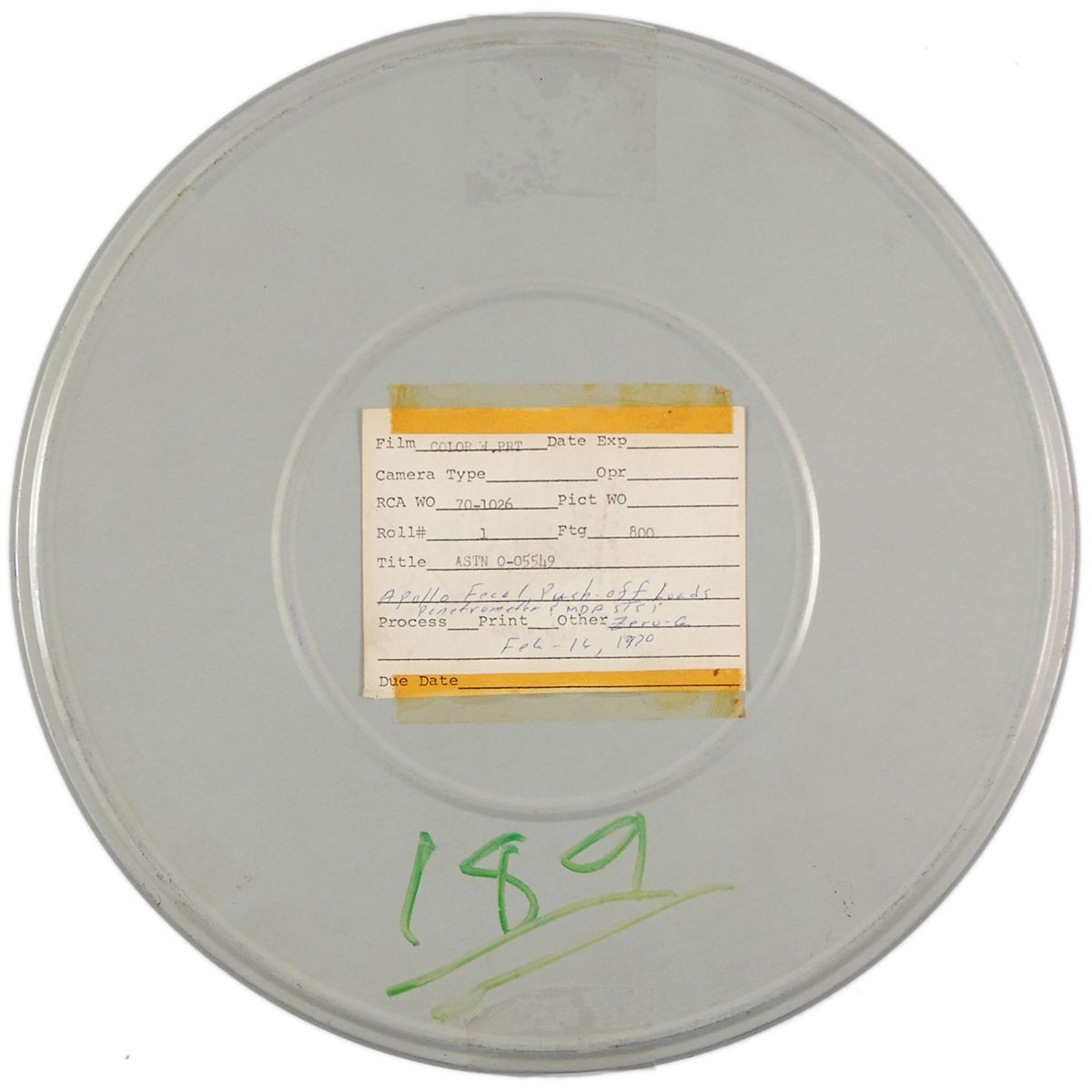 Original canister of film from the Apollo program. Canister measures 10.75? in diameter, and contains one reel of color film (unknown if sound or silent). Label affixed to the cover reads, in part: “STN-0-05549, Apollo Fecal Push-off Loads, Penatrometer & MDA STSP…Zero-G.” Film is 800 feet in length, and is dated February 16, 1970. In fine condition.