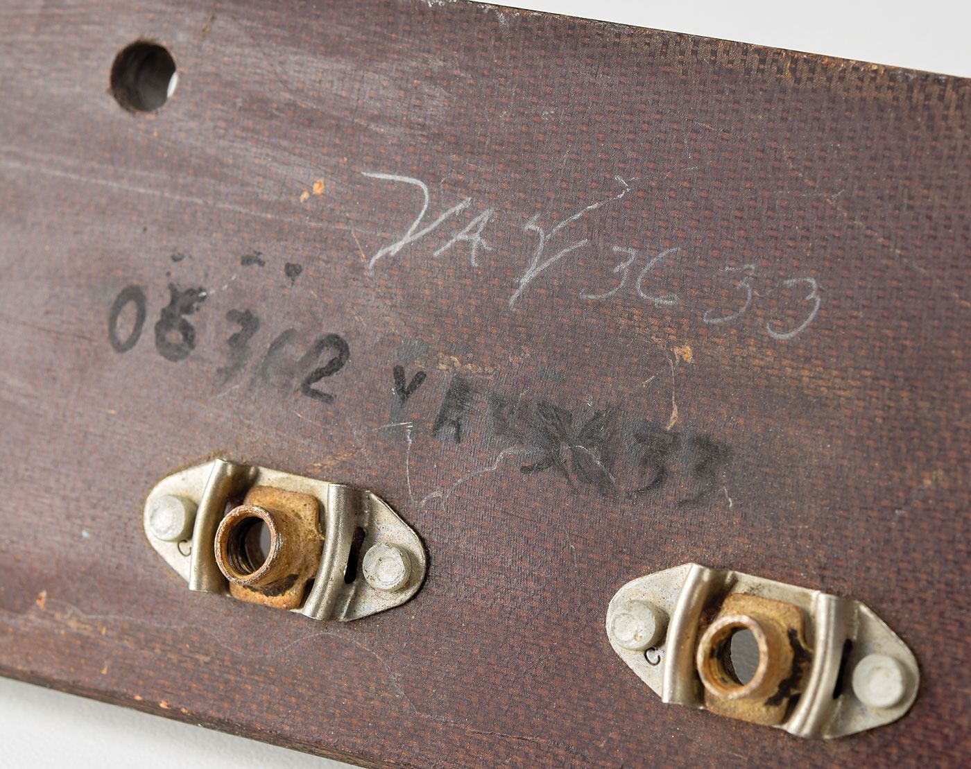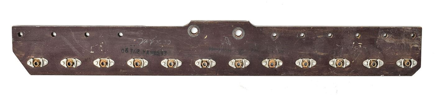 Dark brown fiberglass bracket designed for an Apollo Flight Vehicle (potentially to be used on the deck plate), measuring 18.5˝ x 2.25˝ x .25˝, marked on one side with indistinct black part numbers including "V36." In fine condition.
