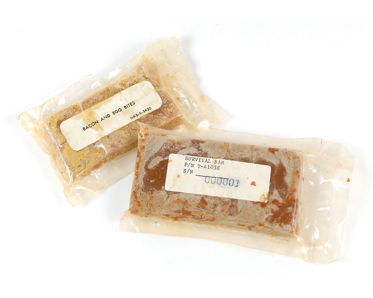 Two unopened freeze-dried packets of Apollo prototype space food. A 4.75 x 3 package labeled “Bacon and Egg Bites”; and a survival bar, 5.5 x 3.25, serial no. 000001. In fine condition.