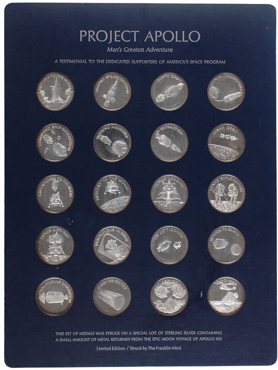 A fine limited edition set of 20 solid sterling silver commemorative medals struck by the Franklin Mint from silver containing a small amount of metal carried aboard Apollo 13, housed in their original display card and presentation folder. The medallions measure approximately 1.25? in diameter and depict the various stages of a lunar mission, from launch to recovery, on the front; all have the same lunar design on the reverse. In overall fine condition, with some light tarnishing to the edges of a few medals. The Leon Ford Collection.