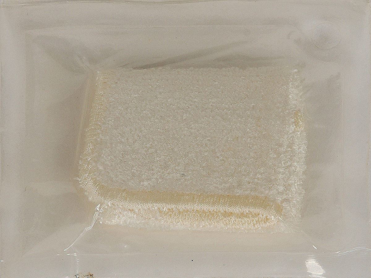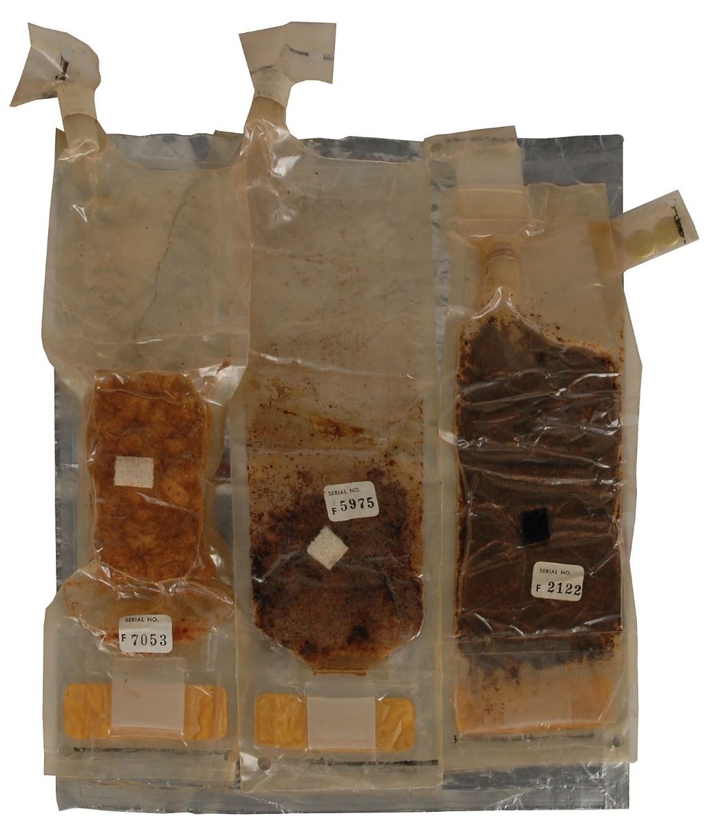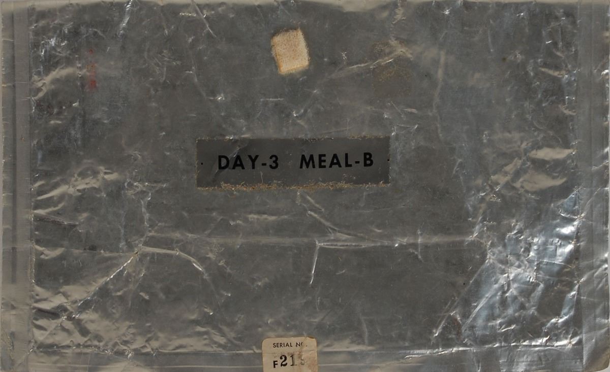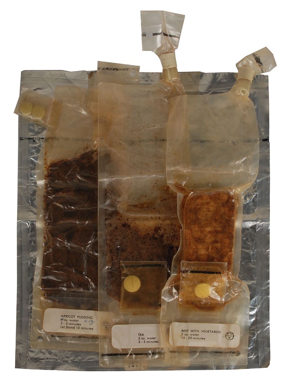 Collection of freeze-dried Apollo-era food from an opened silver foil package identified as “Day-3, Meal-B,” consisting of “Beef with Vegetables,” “Apricot Pudding,” and “Tea,” as well as a sealed washcloth. In overall fine condition.