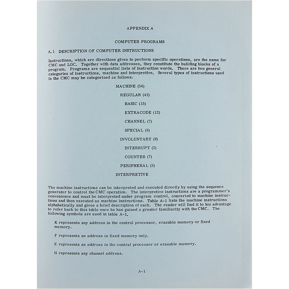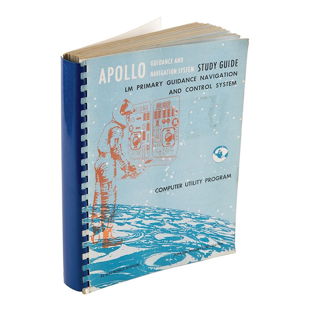 Spiral-bound original manual entitled “Apollo Guidance and Navigation System Lunar Module Study Guide / Primary Guidance, Navigation and Control, System Course 3100, Computer Utility Programs C3100,†Revision B date of November 1, 1967, prepared by the AC Electronics Division of General Motors. The manual, 8.5Ë x 11Ë x 1.5Ë, approximately 296 pages, contains five sections—Introduction to PGNCS Computer Utility Programs, Basic Control Routines, Input/Output Routines, Initialization Control Routines, and Miscellaneous Routines—with numerous related block sections to each, including: General Programming Concepts, Input-Output Channel Interface, Operator/Hardware/Program Interface, The Executive Routine, ISS Model Switching, and more. In fine condition, with some wear, label remnants, and slight creasing to the front cover. An impressive early guidebook detailing the G&N of the Apollo lunar module.