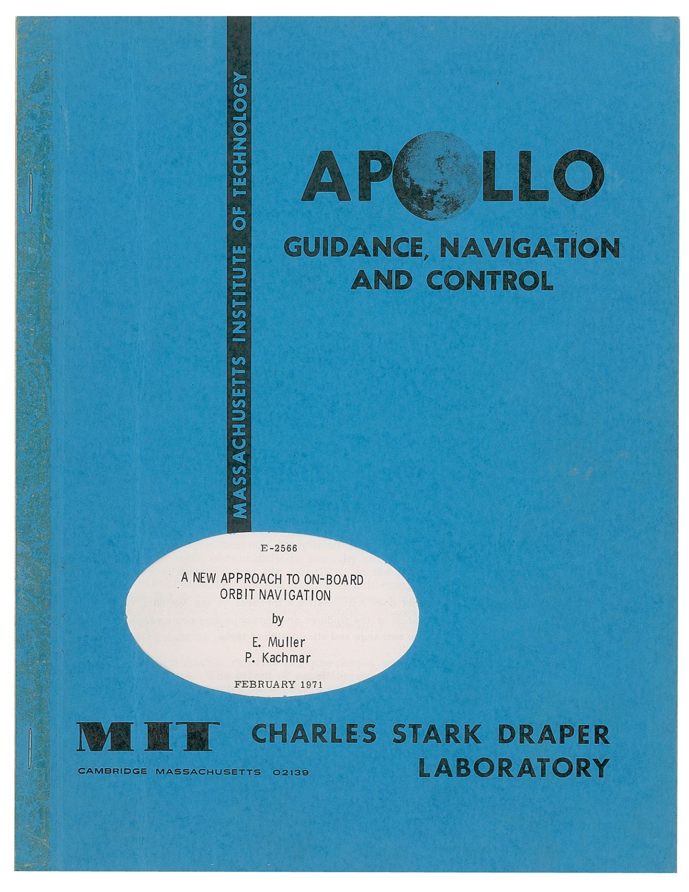 Fascinating "Apollo Guidance, Navigation and Control" report from the Charles Stark Draper Laboratory at the Massachusetts Institute of Technology, entitled "A New Approach to On-Board Orbit Navigation" by Eugene Muller and Peter Kachmar, presented at the Institute of Navigation, National Space Meeting in Huntsville, Alabama, between February 23-25, 1971. The report features complex mathematical theorems involved with calculating trajectories related to the orbit navigation system. In very good to fine condition, with a vertical fold to left side and adhesive remnants to both sides of spine edge.