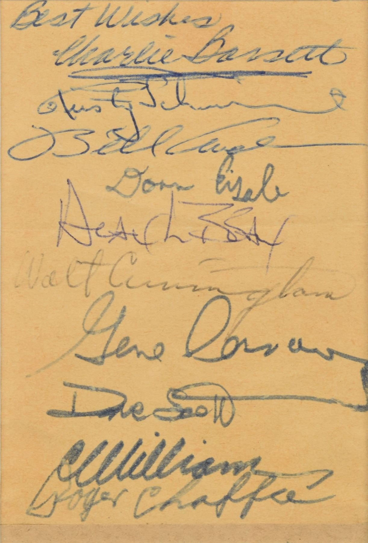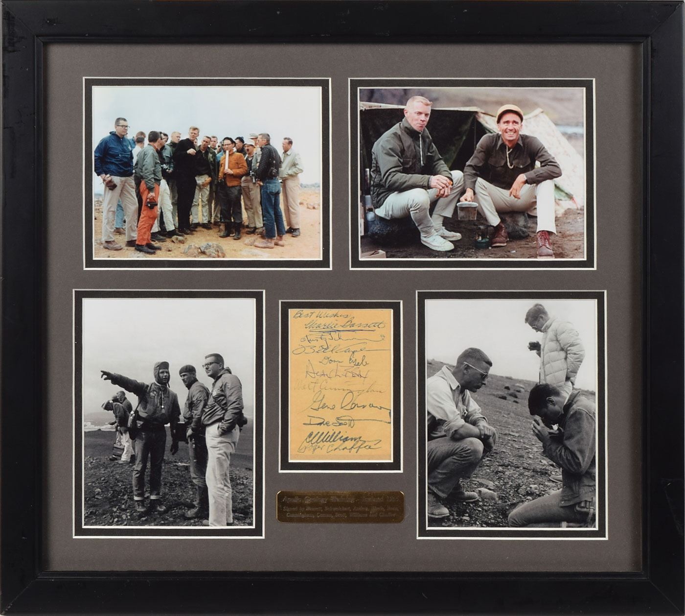 Rare set of vintage circa 1965 felt tip and ballpoint signatures, accomplished on an off-white 2.5 x 3.75 sheet, of the ten Apollo astronauts who underwent geology field training in Iceland: "Best Wishes, Charlie Bassett," "Rusty Schweickart," "Bill Anders," "Donn Eisele," "Alan L. Bean," "Walt Cunningham," "Gene Cernan," "Dave Scott," "C. C. Williams," and "Roger Chaffee." Handsomely double-matted and framed with a plaque and four images of their geology training to an overall size of 16.75 x 15. In fine condition, with scattered light creasing. The ten astronauts arrived in Iceland on July 12, 1965, and they spent a week exploring the barren highlands and volcanic geology of Iceland, which they expected to be the most moonlike of any earthly landscape. A very rare assemblage, as Charles Bassett and Clifton Williams were both killed in T-38 jet accidents, and Chaffee died in the Apollo 1 fire.