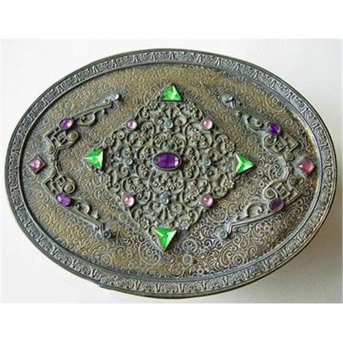 This jewelry box was produced for or by the Apollo Studios of NY circa 1920. Featuring a lid with an intricate design on the brass and several filigree medallions adorned with colored glass jewels. Marked APOLLO 3131 - The oval box measures 5 3/4 inches x 4 1/2 x 1 1/2 inches tall. The inside of the lid is worn as is the lining. Otherwise in very good condition.