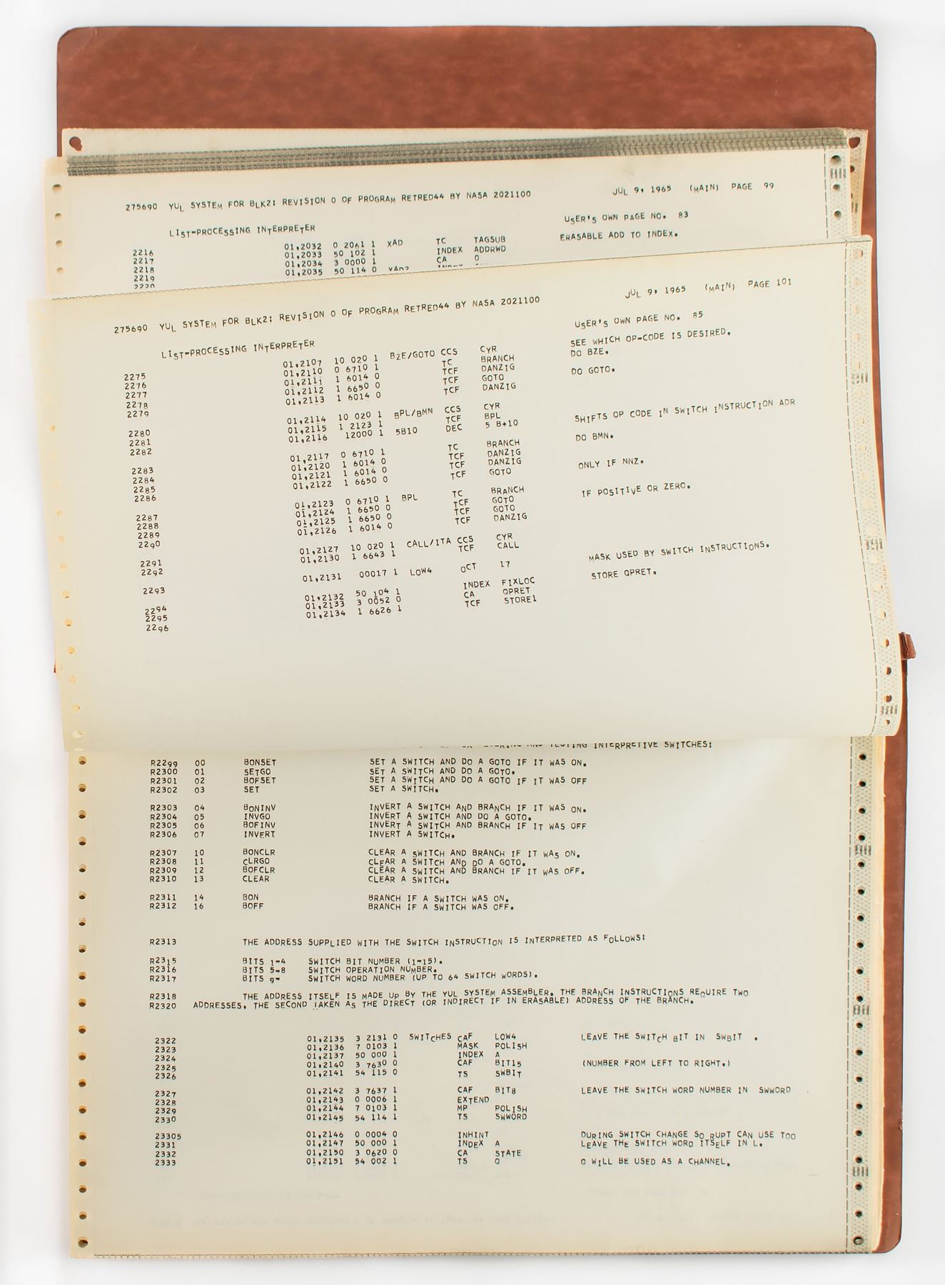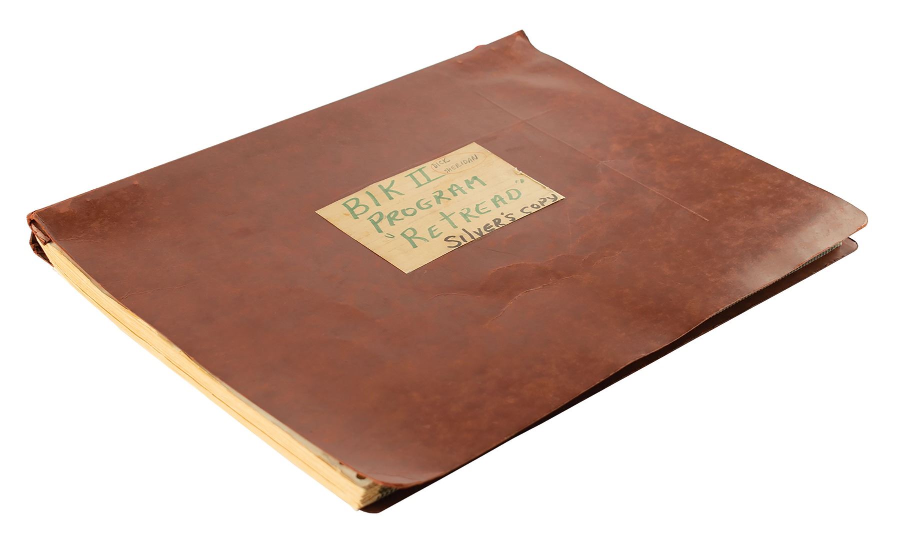 Original printout of the assembly listing for the Apollo Guidance Computer program called "Retread 44," 304 pages, July 9, 1965, held within a contemporary 15.25˝ x 11.5˝ x 1˝ binder, marked on the front: "BLK II Program 'Retread,' Silver's Copy, Dick Sheridan." The listing is headed "275690 YUL SYSTEM FOR BLK2: REVISION 0 OF PROGRAM RETRED44 BY NASA 2021100." In very good to fine condition, with general wear and creasing to a few pages.