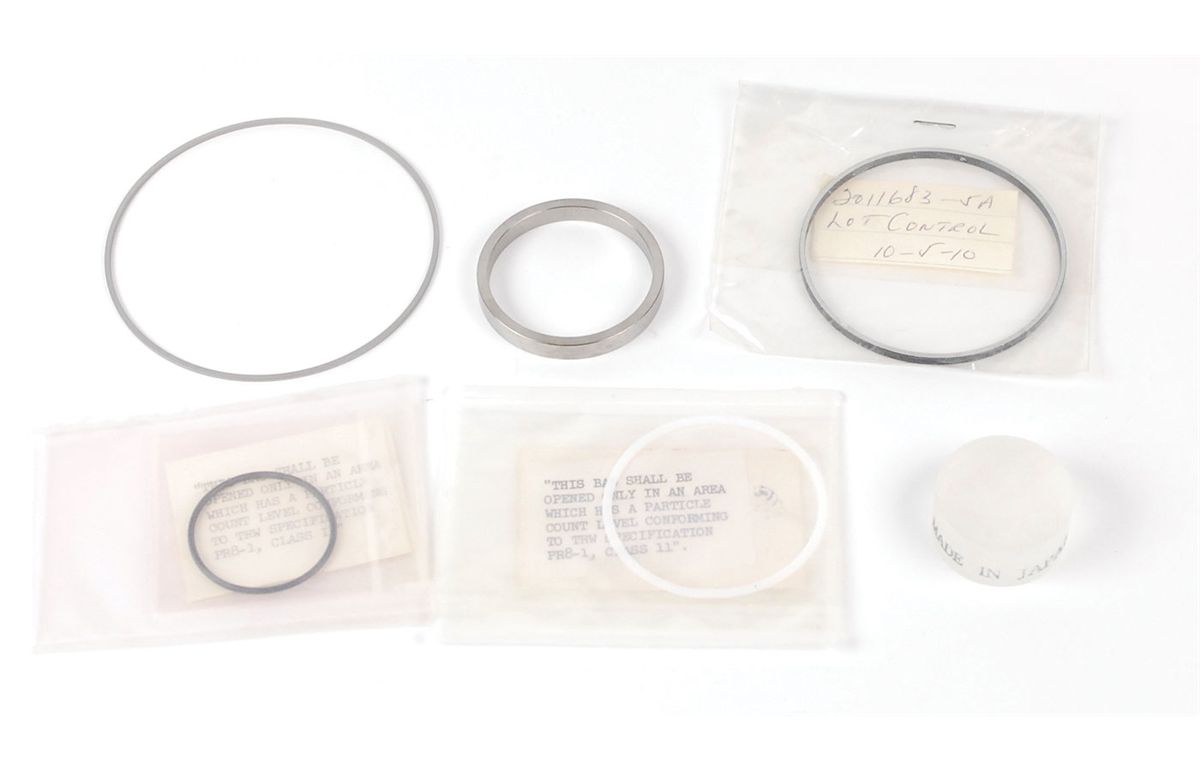 Collection of six MIT-designed Apollo Guidance and Navigation optics parts manufactured by the Kollsman Instrument Company: five metal and plastic blank lenses of various thickness; and a 1.5? diameter piece of a semi-translucent material, stamped around the edge, “Made in Japan.” All five lens blanks are in their clean room packaging. In fine condition.