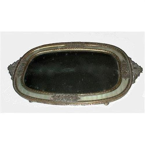 Produced by APOLLO during the early 20th century this dressing table mirror or vanity tray is adorned with an ornate brass rim, a glass covered 1/2 inch guilloche enamel, or perhaps its green silk, border surrounding a 10 x 6 inch mirror surrounded by another brass rim. Intricately designed brass handles, four, symmetrically placed, ornate filigree medallions and four ball feet complete this outstanding turn of the century tray. Marked on the rim APOLLO 3552 ? 12. The entire piece measures 13 ½ inches x 8 inches including handles. With the exception of some tarnishing, due to age, and minor discoloration to the mirror the condition is excellent