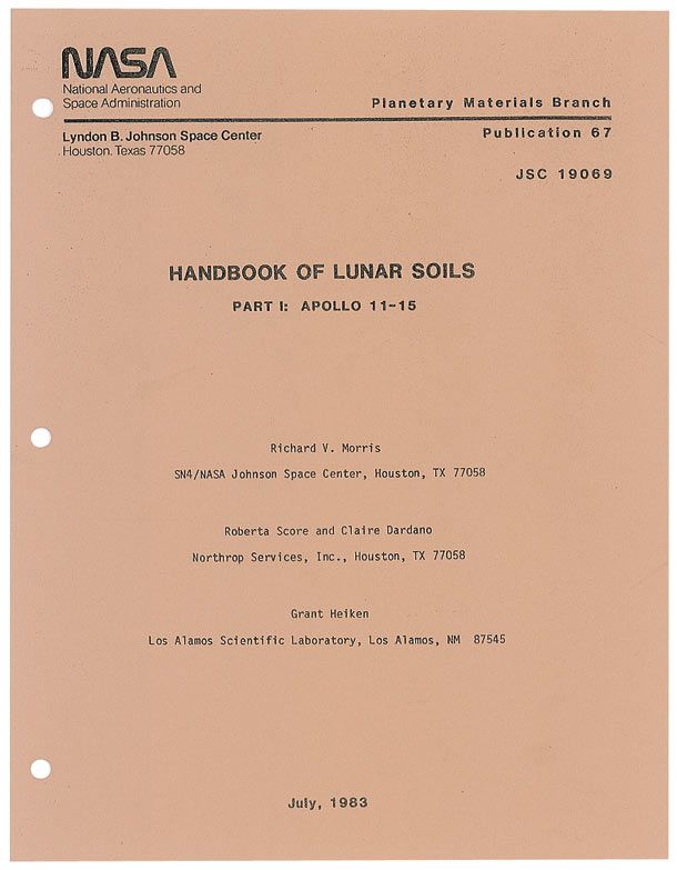 Unbound Handbook of Lunar Soils, Part I: Apollo 11–15 handbook, 8.5 x 11, dated July 1983, 421 pages. Introduction states “The purpose of this handbook is to serve as a data base for the material properties of lunar soils. It is a resource for present and future sample investigators in selecting soil samples for detailed study, for investigators conducting syntheses studies, and for scientist and engineers designing manufacturing processes utilizing lunar soil.”