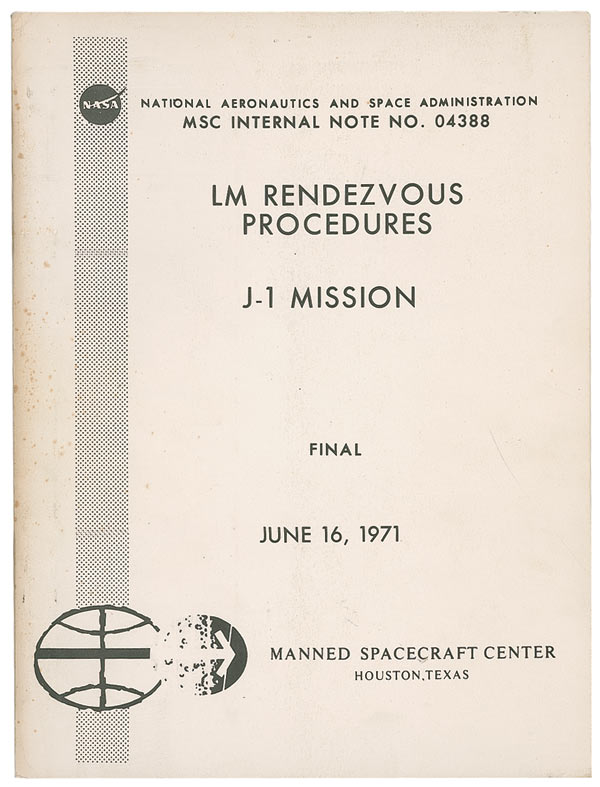 Printed copy of the Final LM Rendezvous Procedures J-1 Mission, 8.25 x 10.5, dated June 16, 1971. First page is a copy of the submission bearing copies of signatures of Stephen Grega, James Bilodeau, and Deke Slayton. In fine condition, with scattered toning and foxing.