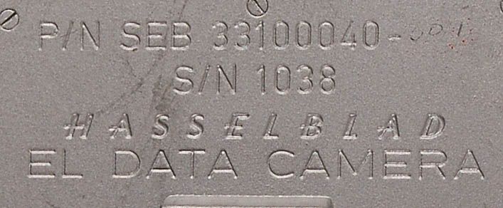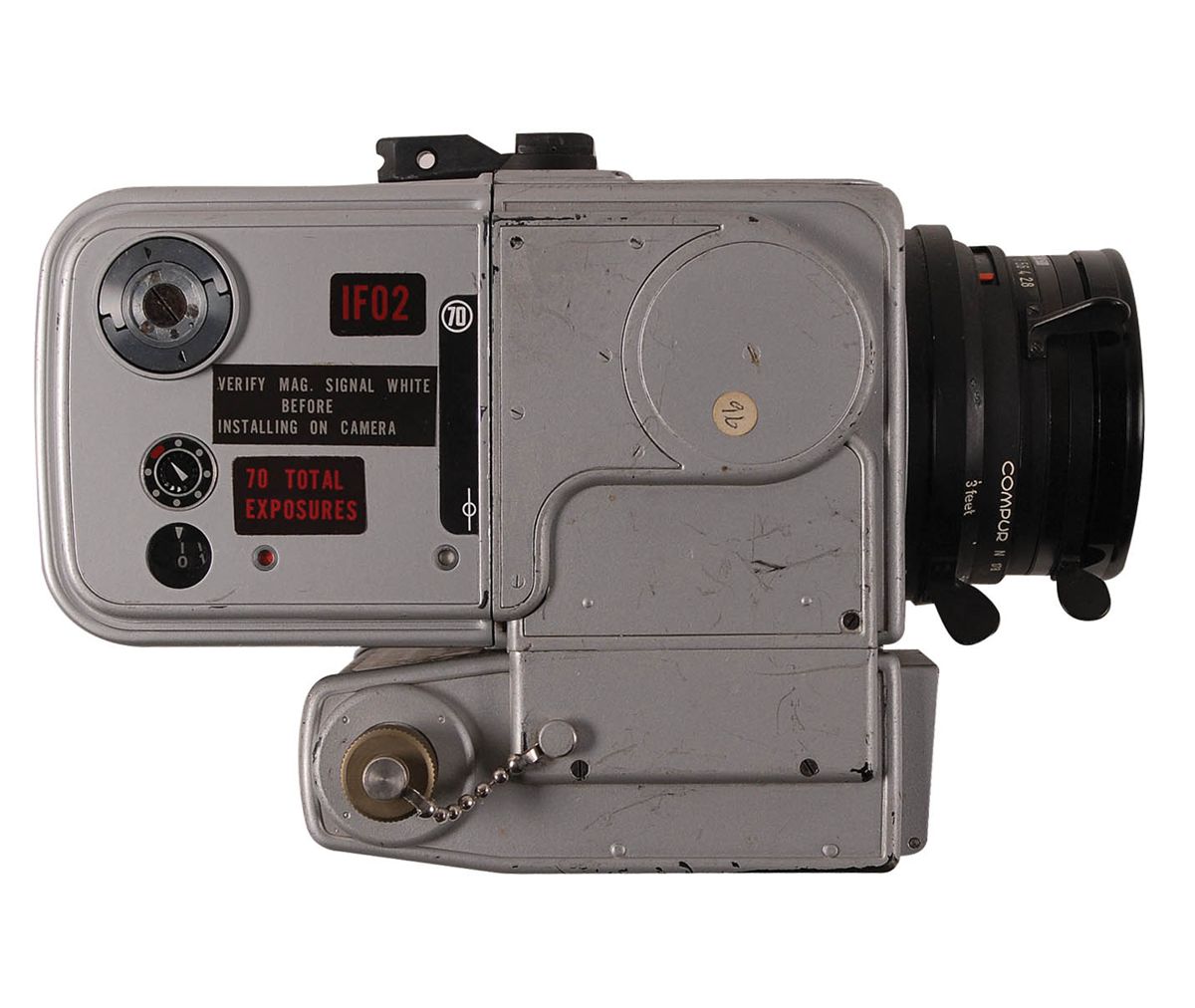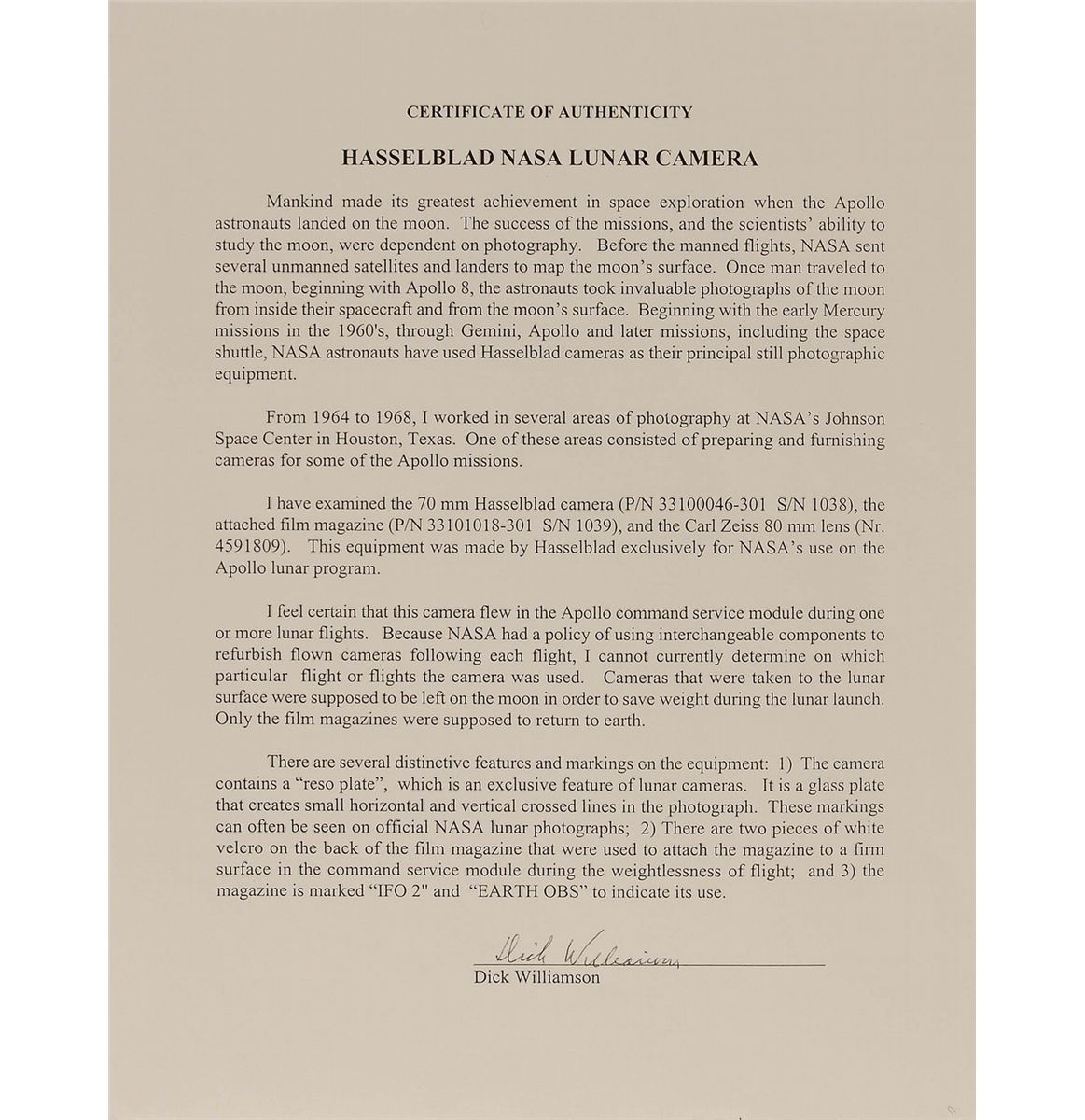 Apollo-era Hasselblad 70 mm EL Data camera intended for application on the lunar surface, “P/N SEB 33100040-301, S/N 1038,” with attached film magazine, “P/N 33101018-301, S/N 1039,” as well as a Carl Zeiss 80 mm lens. Back of the magazine bears two labels which read, “Earth Obs,” and “IFO2,” as well as two small squares of Velcro. Accompanied by a letter of authenticity from NASA Aerial, Instrumentation and Motion Picture photographer Dick Williamson, which reads, in part: “I have examined the 70 mm Hasselblad camera…the attached film magazine…and the Carl Zeiss 80 mm lens…This equipment was made by Hasselblad exclusively for NASA’s use on the Apollo lunar program. I feel certain that this camera flew in the Apollo command service module during one or more lunar flights…" Flown provenance has not been positively established by RR Auction.