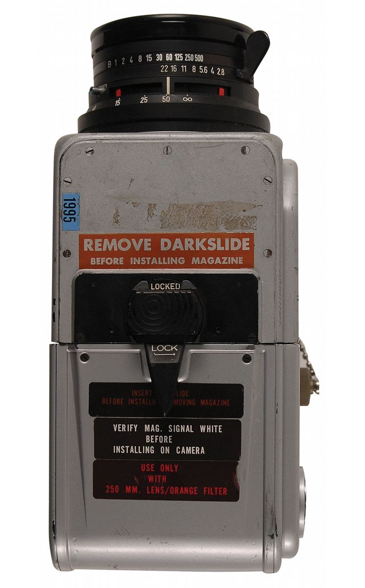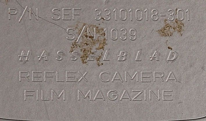 There are also several distinctive features and markings on the equipment: 1) The camera contains a ‘reso plate,’ which is an exclusive feature of lunar cameras. It is a glass plate that creates small horizontal and vertical crossed lines in the photograph, 2) There are two pieces of white Velcro on the back of the film magazine that were used to attach the magazine to a firm surface in the command service module…and 3) the magazine is marked ‘IFO2,’ and ‘EARTH OBS’ to indicate its use.” In fine condition, with scattered light wear.