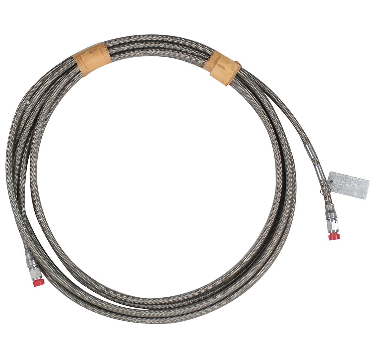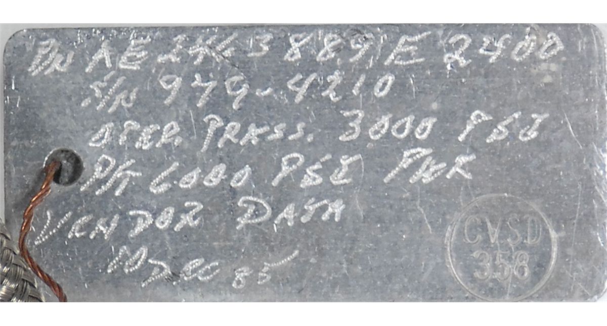 Long Apollo-era high pressure pneumatic hose. Hose is wrapped in silver cloth braid with screw-on connectors at each end, bearing a metal tag engraved with “Aeroquip” and various numbers. Also bears a hanging metal tag hand-engraved with information about PSI. Hose was likely Ground Support Equipment. In fine condition.