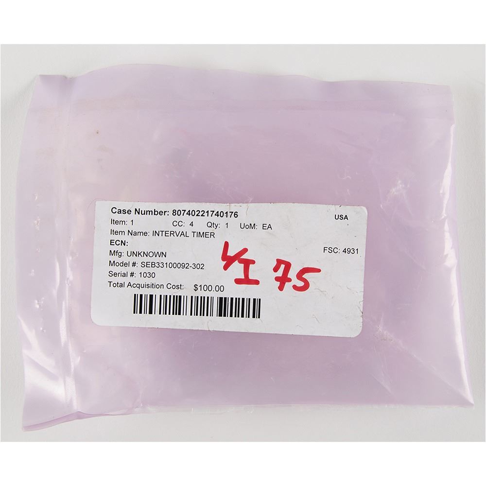 A stainless steel Apollo Interval Timer (also known as a two-speed timer) as used on Apollo 10–17, measuring 2.75Ë in diameter and 2Ë tall, engraved on the back with part numbers: "P/N SEB33100092-302, S/N 1030 Assy., P/N SEB33100092-002." Reverse also bears an affixed Velcro swatch. Timer is in fine cosmetic condition; while it does rotate when wound, it does not seem to sound its bell consistently. Accompanied by its plastic bag with deaccession label.