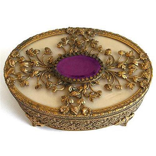 Produced for, and perhaps by, Apollo of New York, circa 1930, this ormolu, jeweled and filigreed jewelry box, features a lid with floral openwork and a large, centered, prong set, beveled amethyst glass jewel all over glass with a beige satin lining beneath. The Interior is lined in Red Velvet. The box has an intricate filigree design and sits on four ornate feet. Marked on the Bottom ? APOLLO - Measures 6" wide x 4" deep x 2 3/4" tall and is in excellent condition.
