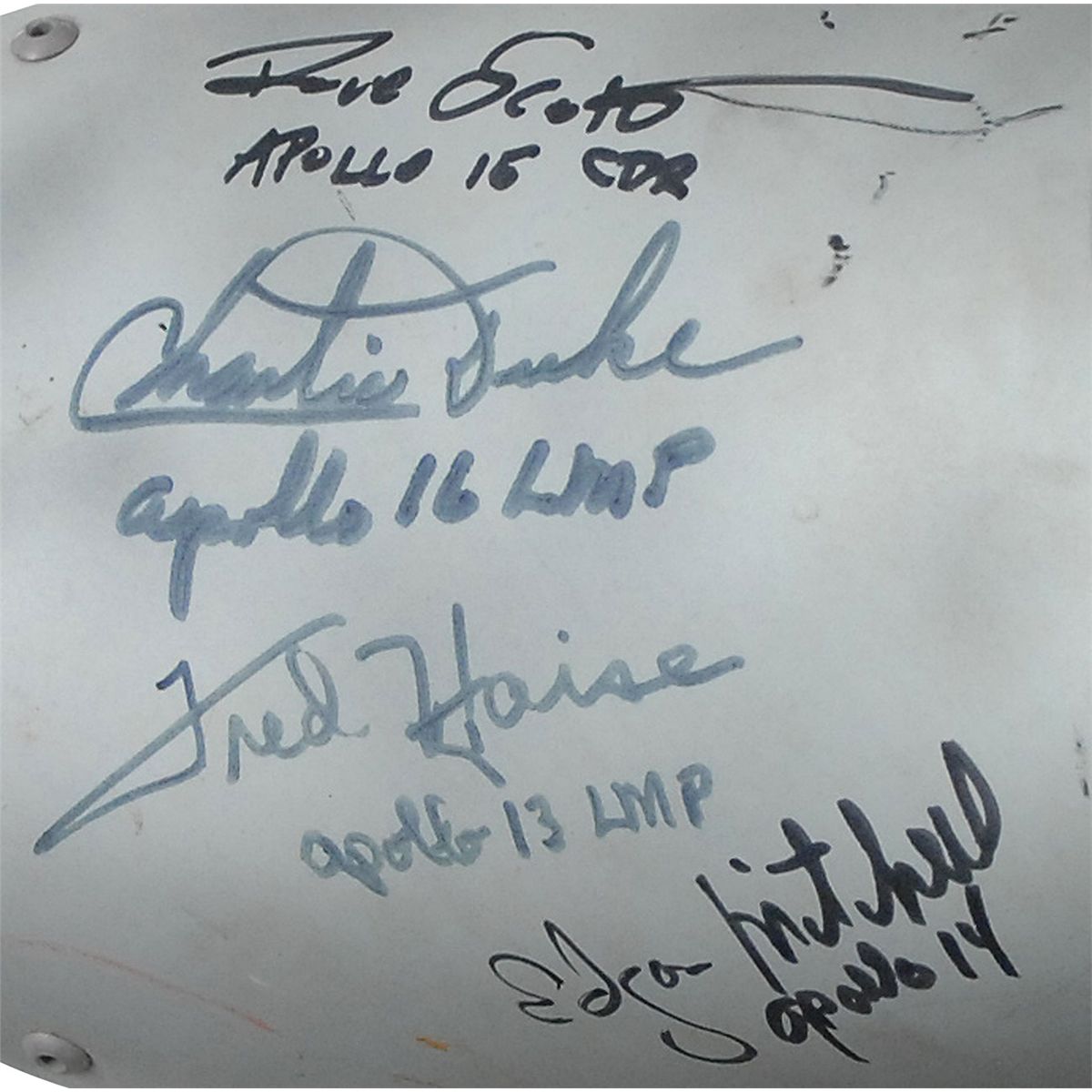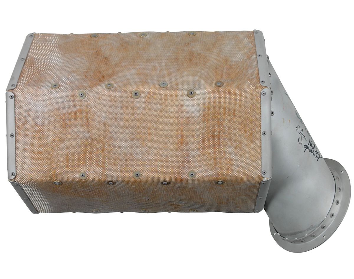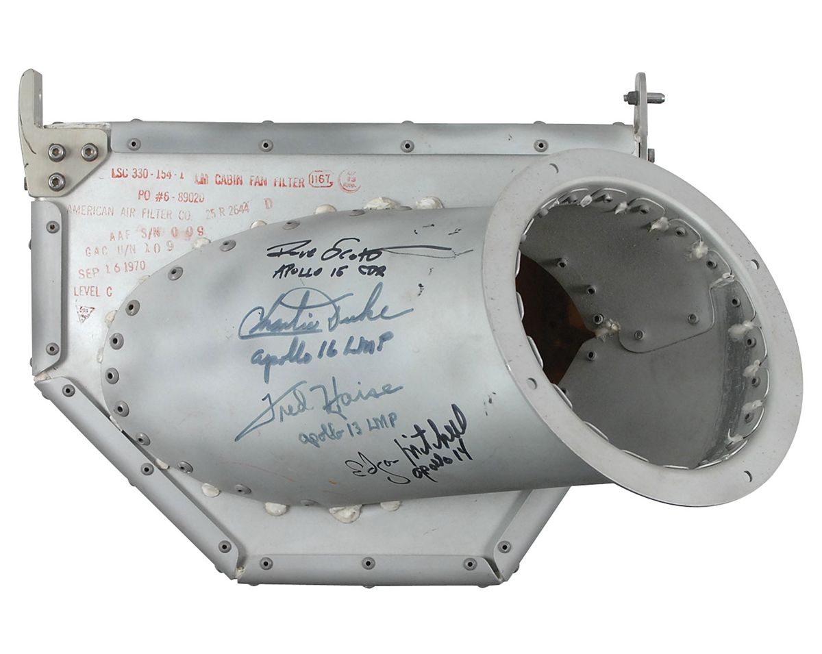 Apollo Lunar Module Cabin Fan Filter. Filter measures 10 x 17 x 7 and was made by American Air Filter for NASA’s Grumman Aerospace Corporation, with “LM Cabin Fan Filter,” as well as the manufacturer’s number and serial number stencilled on the top, and dated September 16, 1970. Filter is signed on the duct in black felt tip by four Apollo Lunar Module pilots: Dave Scott, Charlie Duke, Fred Haise, and Edgar Mitchell, each adding their mission under their signatures. In overall fine condition. A great Apollo relic signed by four astronauts who counted on filters such as these for their survival in space.