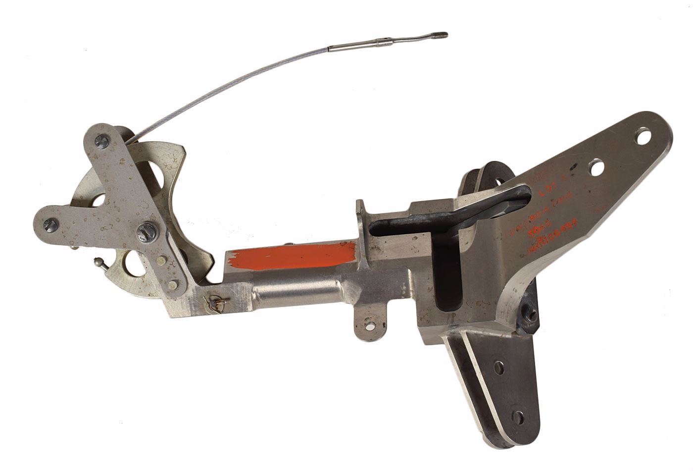 The two main parts of the Apollo Lunar Module Modular Equipment Storage Assembly (MESA) locking and deployment mechanism. The locking and deployment mechanism measure approximately 12 x 6.5 x 3.5 and bears part numbers in orange-red text on the base, "Lot 3, LDW 280M17816, E0A6, MRR106498." The cable arm assembly measures approximately 10.5 x 7.25 x 3, and bears a faint part number that appears to begin, "LTM280M506." This part is missing a cam, otherwise the mechanism is complete. In very good to fine condition.