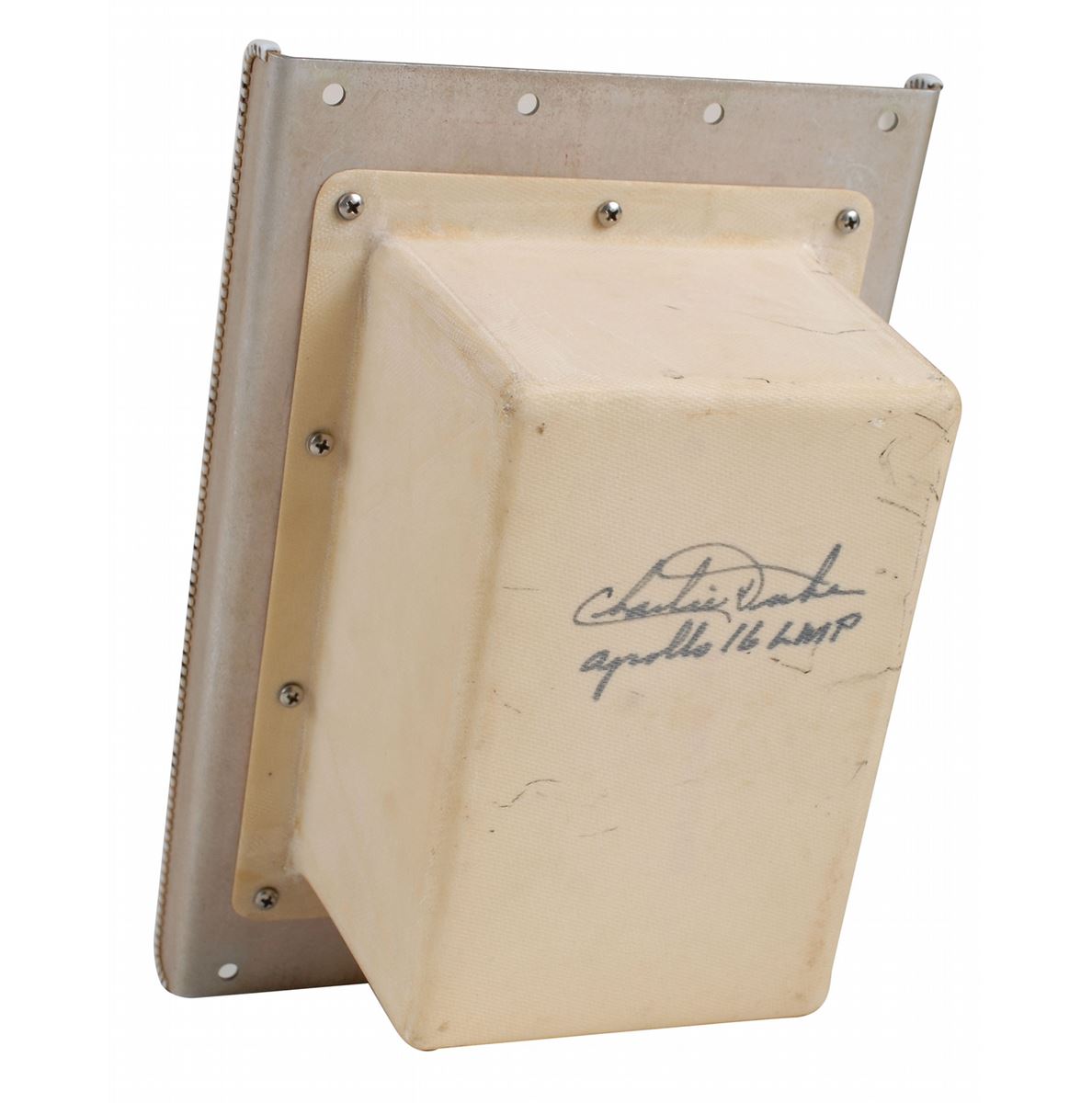 An Apollo Lunar Module relay junction box, 7 x 11 x 4.75, signed on the white plastic cover in black felt tip, “Charlie Duke, Apollo 16 LMP.” The cover unscrews from the metal plate base to reveal the bundles of wires and electrical connectors within. The plate is numbered in the lower right “LDW355-10038-11,” and each connection is identified in similar black text. Scattered marks and dings to the plastic cover, otherwise fine condition. This LM junction box would be used between batteries and electrical buses, and to disconnect, deadhead, and isolate the Descent stage from the Ascent stage prior to liftoff from the lunar surface.