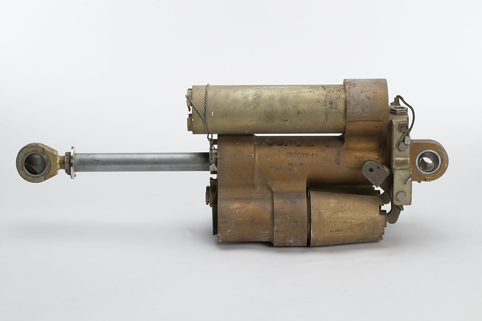 Apollo Launch Escape Tower Canard Actuator, measuring 23? x 8? x 6.5?, with worn part numbers on the sides and bottom; the central piece is marked, "Assem. V15 590202 11, C652716, Apr 29 1969." The side is marked, "Re Mfg Jul 9 1970, 3rd Q 70." In very good to fine condition. Artifacts from the Apollo Launch Escape System are extremely rare.