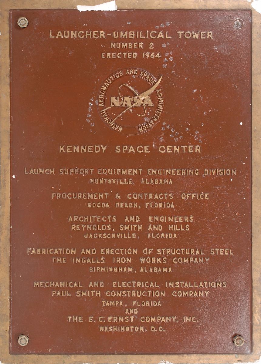 Remarkable 1964 commissioning plaque, 20 x 28, removed from the Launcher—Umbilical Tower Number 2 at the Kennedy Space Center. Constructed of heavy plaster with original bolts fastened to three corners, the formidable plaque features raised text listing the various agencies involved in the tower’s construction, in part: “Launch Support Equipment Engineering Division…Procurement & Contracts Office…Architects and Engineers, Reynolds, Smith and Hills…Fabrication and Erection of Structural Steel, the Ingalls Iron Works Company…Mechanical and Electrical Installations, Paul Smith Construction Company…and The E. C. Ernst Company, Inc.” Reverse is humorously labeled in black stenciling, “Union made on paid lunch.” In fine condition, with chipping to upper border and corners, with potential for future damage due to the vulnerable material used. Fabricated by workers from the aforementioned Ingalls Iron Works of Birmingham, Alabama, this incredible original commissioning plaque was removed from Launch Umbilical Tower 2 prior to its dismantlement and reconfiguration—the tower was later re-designated as Mobile Launch Platform 2 or MLP-2. The LUT 2 holds the distinction of launching Apollo 6, Apollo 9, lunar landing missions Apollo 12 and 14, and the subsequent launch of the Skylab Orbital Workshop. A truly impressive artifact commemorating some of NASA’s most enduring missions. Oversized.