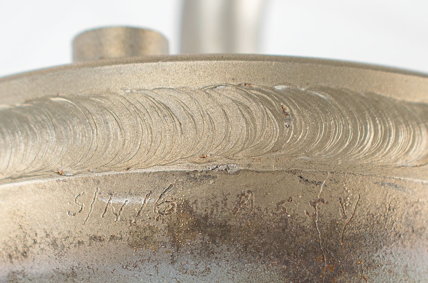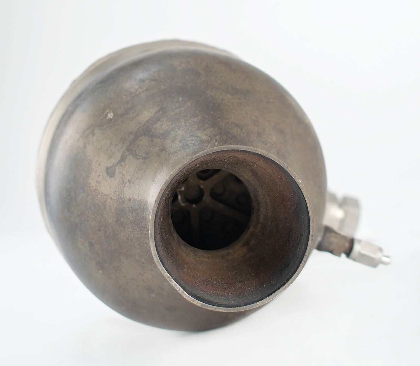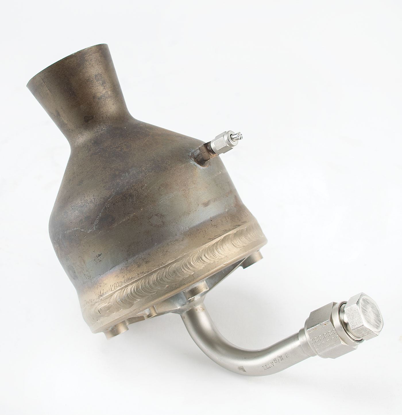 Flown thruster rocket engine deinstalled from Lunar Landing Training Vehicle 952 (LLTV #3) following its application on multiple flights, documented with an operational (engine run) time of 2 hours, 11 minutes and 27 seconds. The engine measures approximately 9˝ x 7˝ x 5˝, and is stamped on the propellant inlet: "LLRV S/N 2." This serial number pertains to the motor, rather than the vehicle; the LLTV superseded the Lunar Landing Research Vehicle (LLRV) and the motors were reappropriated for the LLTV as they both used the same propulsion system. The Bell-manufactured 500-pound thrust hydrogen peroxide motors were installed on the LLTV in a vertically-mounted configuration as 'lift' rockets, and were used to simulate the one-sixth lunar gravity the Commander/Lunar Module Pilot would encounter during descent to the moon's surface.