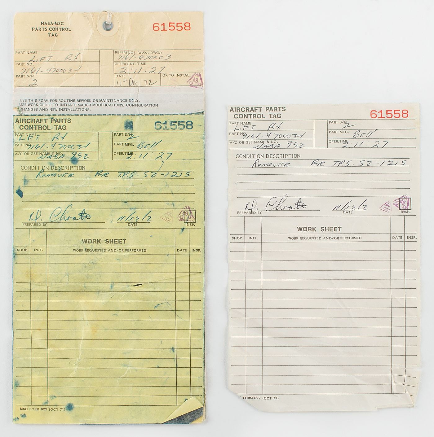 Accompanied by NASA-MSC parts control tags dated December 11, 1972, describing the engine: "Part Name: Lift Rt, Part No. 7161-470003-1, A/C or GSE Name & No. NASA 952, Part S/N 2, Part Mfg. Bell, Oper. Time 2:11:27, Removed per T.P.S. 52-1215." NASA's Lunar Landing Research Vehicle Monograph (SP-2004-4535) states that average flight time was 7 minutes, indicating that this rocket engine supported approximately 18 training flights throughout its two hours of operation. Following removal (as directed via Test Preparation Sheet (TPS) 52-1252), the lift engine was downgraded by NASA to 'Not for Flight' status and decommissioned.