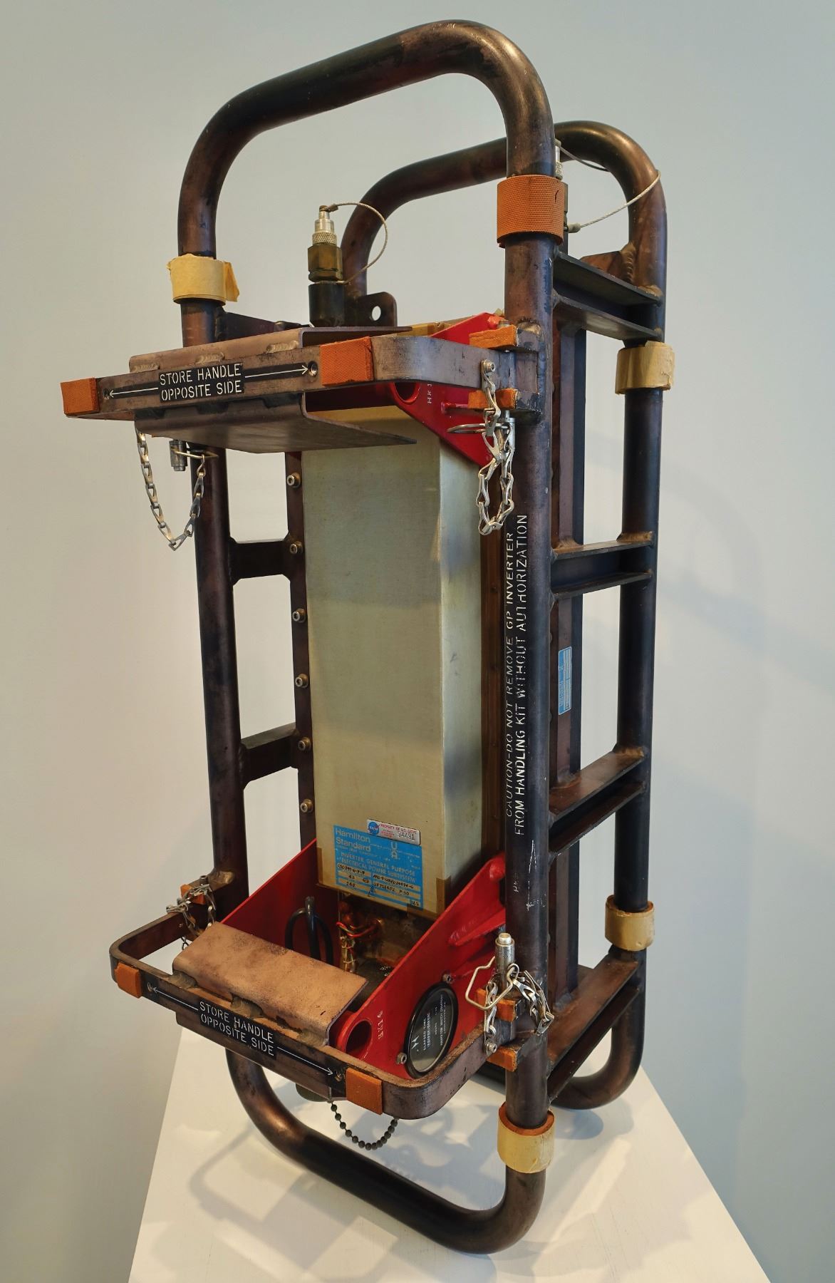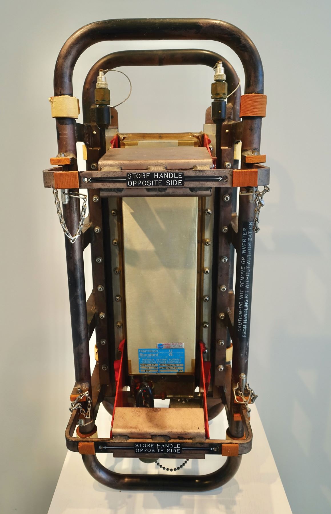 Rare flight version of an Apollo Lunar Module AC Power Inverter in its handling frame, measuring an overall 11˝ x 29.5˝ x 12˝ and weighing 41 lbs, with a NASA/Manned Spacecraft Center property tag and Hamilton Standard label on the unit: "Inverter, General Purpose Electrical Power Subsystem, Design Control No. LSC-390-6-9-7, Contract No. NAS-9-1100/2-24494-C, Unit No. 43, HS Part No. SV718452 P10, Serial No. 145." A Hamilton Standard plate on the handling frame reads: "Handling Kit, Inverter, Part No. SV714594, Serial No. HK14, HS Ref No. 19932 A." A Hamilton Watch Company "elapsed time" indicator is set into the frame. In very good to fine condition. This piece will be crated and shipped from California; the buyer is responsible for all associated costs.