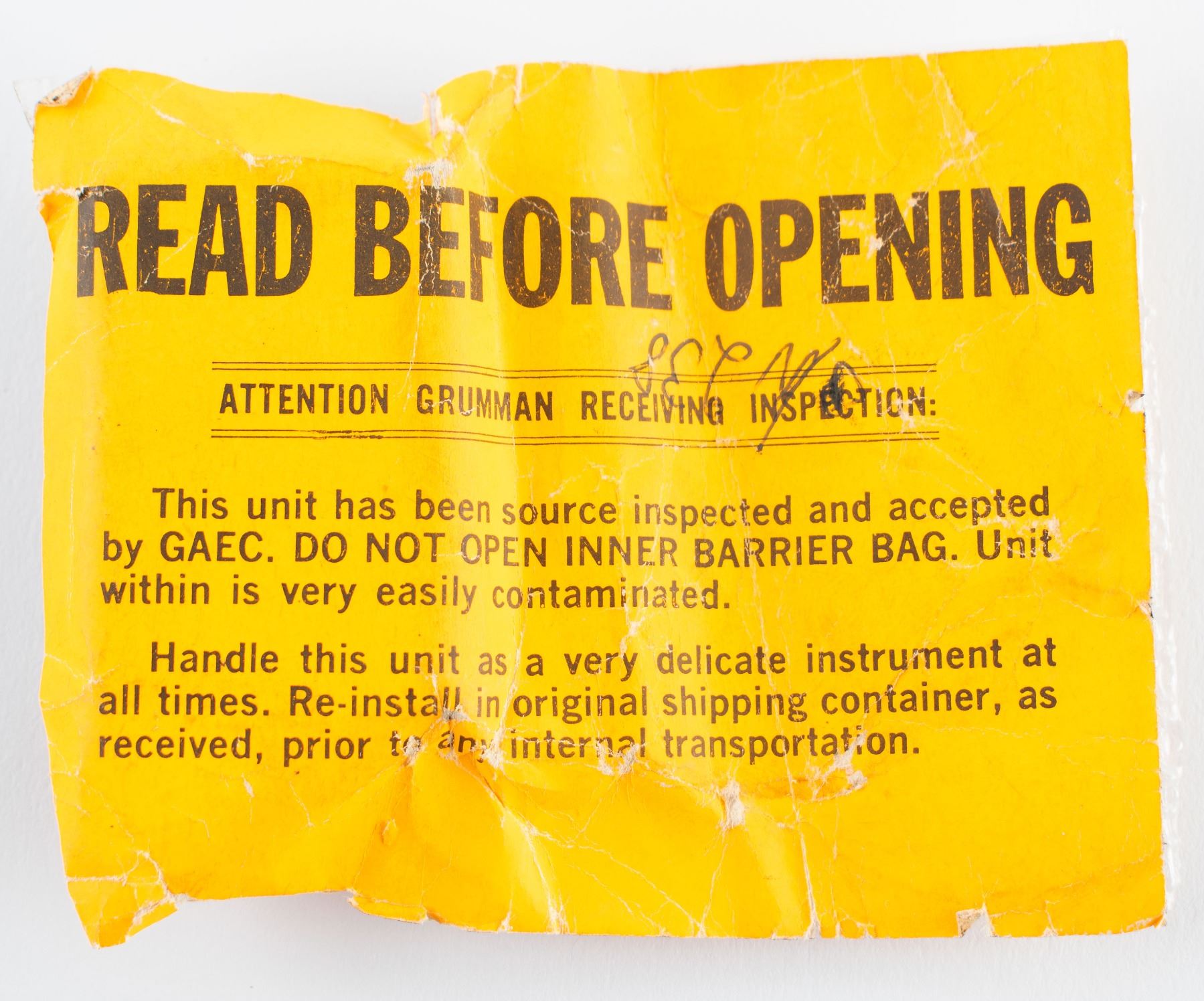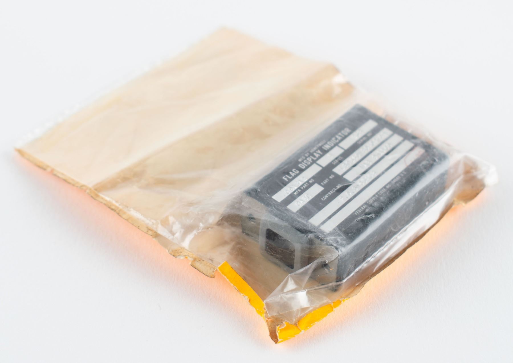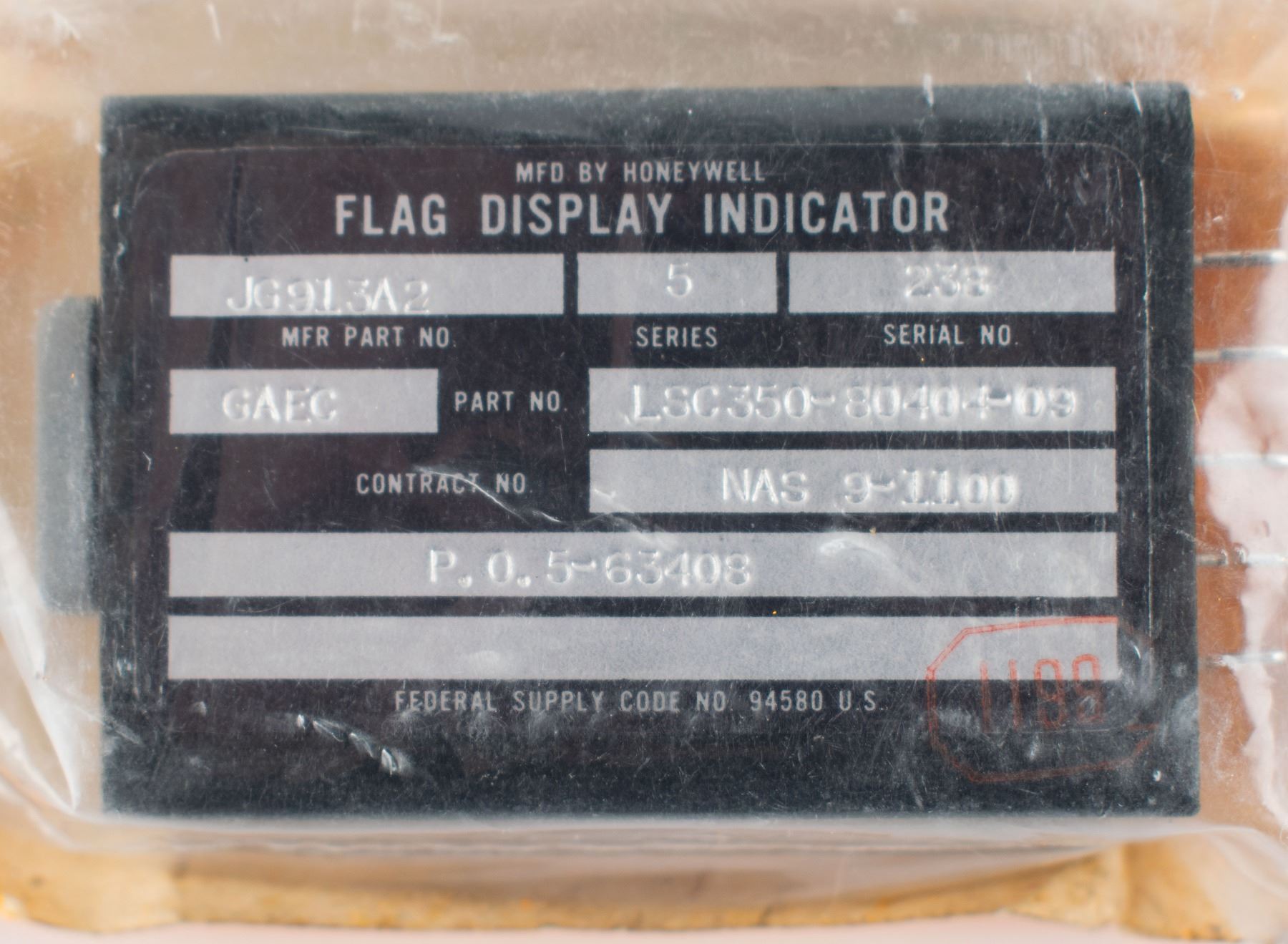 Talkback indicator—commonly called a 'barber pole' due to its black-and-white stripes—for the Apollo Lunar Module, measuring 1.75˝ x 1˝ x .5˝, sealed in its Grumman packaging with "Read Before Opening" tags. An affixed Honeywell parts tag reads: "Flag Display Indicator, Mfr Part No. JG913A2, Series 5, Serial No. 238, Part No. LSC350-80404-09, Contract No. NAS 9-1100." Mounted on the instrument panels, 'barber pole' indicators were used to denote the status of various systems: when covered by a gray flag, the system was operating as normal; in the case of an abnormal or in-progress status, the flag would be actuated to reveal the 'barber pole' as a visual indicator. In overall fine condition.