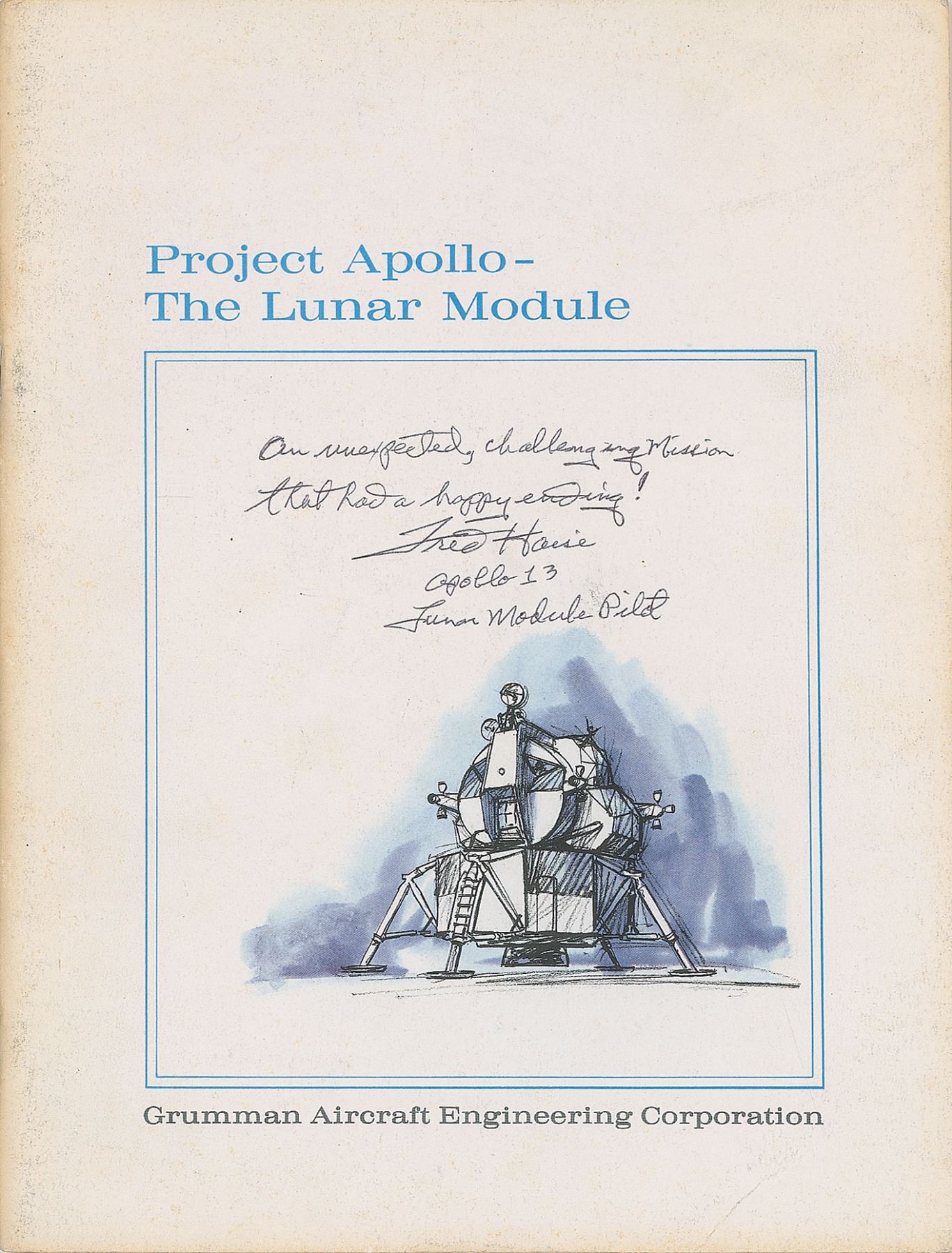 Uncommon booklet entitled "Project Apollo—The Lunar Module," published by the Grumman Aircraft Engineering Corporation in January 1968, 35 pages, 8.5 x 11, signed on the front cover in black ballpoint, "An unexpected, challenging mission that had a happy ending! Fred Haise, Apollo 13, Lunar Module Pilot." In fine condition.
