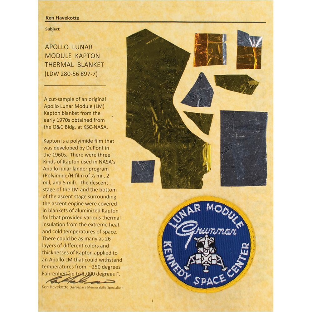 Collection of eight swatches of Apollo Lunar Module Kapton foil obtained from the Operations and Checkout Building at NASA’s Kennedy Space Center in the early 1970s, ranging in size from .75 x .75 to 2.75 x 5.5, all of which are affixed to a presentation sheet prepared by aerospace memorabilia specialist Ken Havekotte, who has signed in the lower left corner. In fine condition.