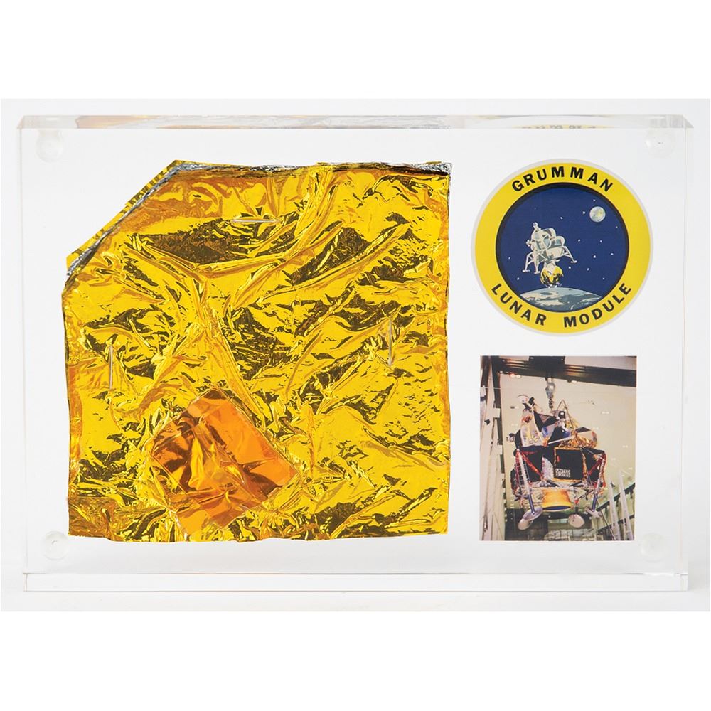 Limited edition acrylic display containing an original 4 x 4 piece of multilayered Kapton foil from a Grumman Lunar Module thermal blanket, numbered 10/25, measuring 7 x 5 x 1, featuring images of the Lunar Module and the Grumman LM logo, with descriptive text on the reverse, in part: "The Kapton Foil was damaged and discarded during a ‘fit check.’ Certified by: Angelo Taiani—Retired NASA Employee." In very fine condition. Taiani was a general space engineer who spent 34 years as a NASA employee, contributing toward the Juno project and Space Shuttle program.