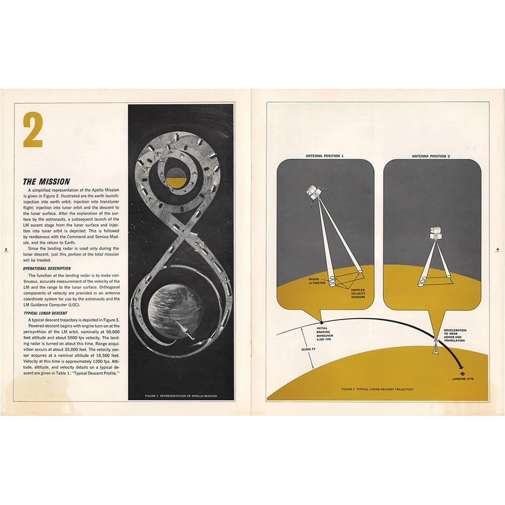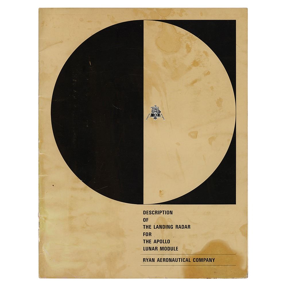 Brochure produced by the Ryan Aeronautical Company, entitled "Description of the Landing Radar for the Apollo Lunar Module," 27 pages, 8.5 x 11, filled with descriptions and graphics illustrating the technology essential to a successful lunar landing. In very good condition, with heavy dampstaining to the front cover, and lighter staining throughout to the lower corners.