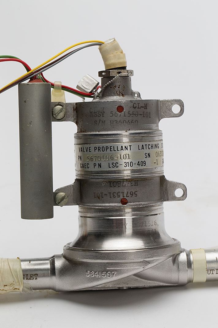 Interesting Apollo Lunar Module Latching Propellant Valve complete with wiring, measuring approximately 6? x 5? x 2?, with a wraparound Parker Aircraft tag at center, reading: "Valve Propellant Latching Sol Oper Oxid, PN 5670106-101, SN 06553H330833 US, GAEC PN LSC-310-409-1 GAEC SN 131." In fine condition.
