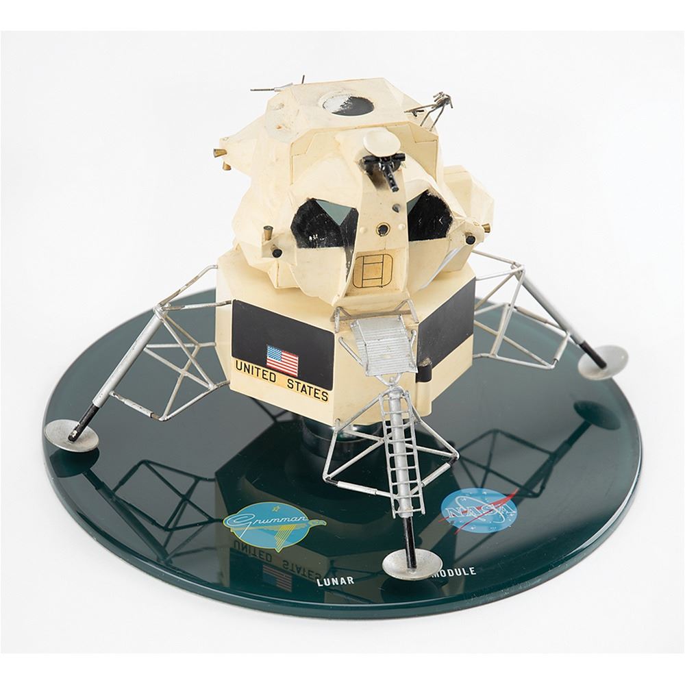 Vintage Apollo lunar module contractor's model, made of injection-molded plastic and measuring approximately 6.5" tall and 10" across. The two-piece LM is removable from the base, separates into ascent and descent stages, and has numerous tiny projecting parts. Includes the original 10.25" diameter black base, with color logos of both Grumman and NASA, as well as the text "Lunar Module" printed near the edge. In very good condition, with scuffing and wear to paint, and the S-band antenna and six thrusters missing. Accompanied by an issue of The Cape Argus newspaper from July 25, 1969, with additional supplementary "Lunar Landing" cover.