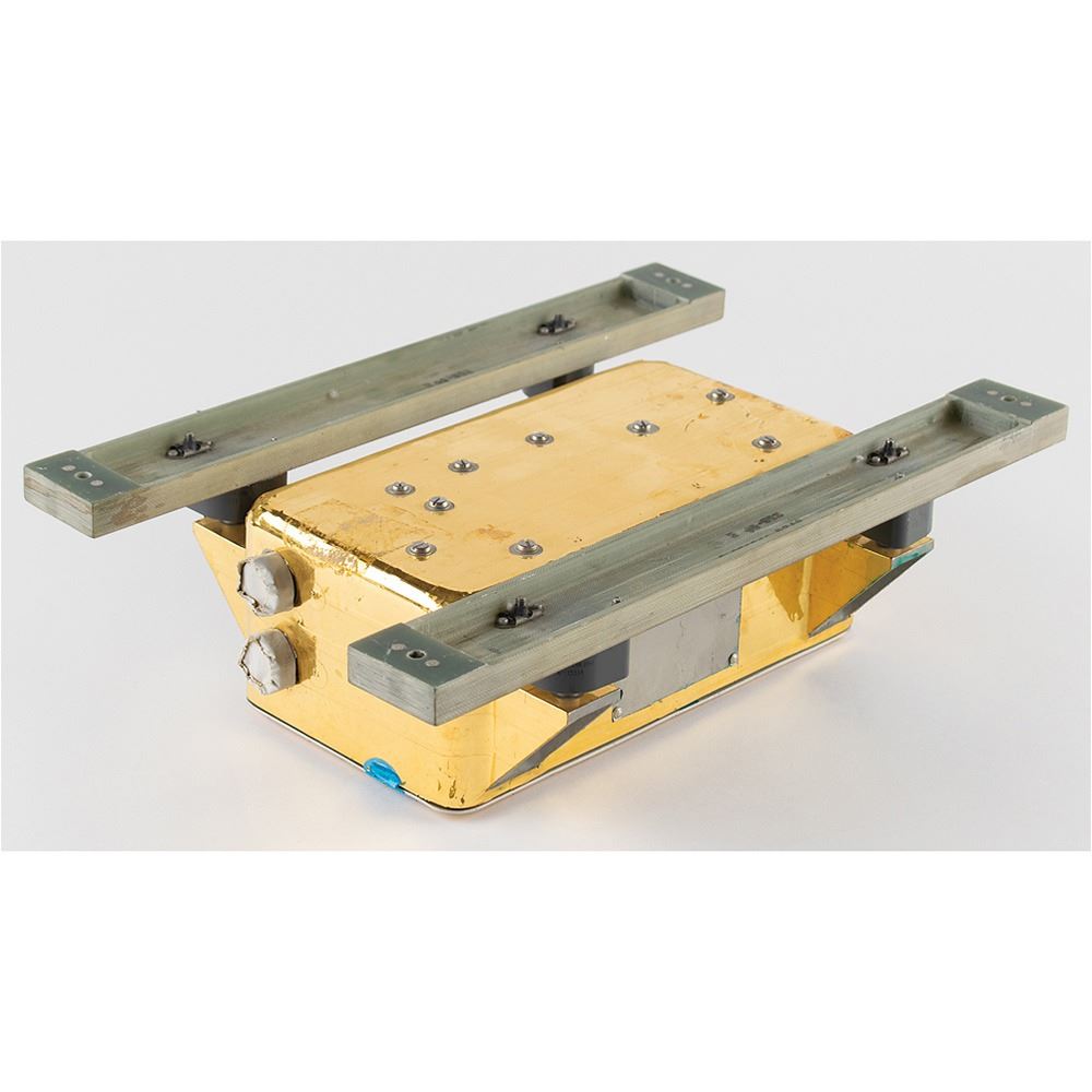 Apollo Lunar Module Separation Sequence Controller, designed by Autionetics to be mounted in the Saturn V Spacecraft Lunar Module Adapter (SLA). Part of the Sequential Control Event System (SECS), the controller was responsible for triggering the squibs (explosive charges) that allowed the Lunar Module to be extracted (by the Command Service Module) after launch. The controller measures 11" x 4" x 9" and is mounted on a pair of 14.5" long fiberglass rails. The unit is covered in thermal foil tape, with no part numbers apparent.