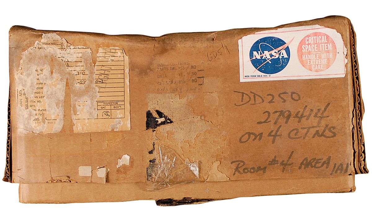 Flight-ready Lunar Module deployment truss manufactured by Grumman Aircraft. This piece comprised part of the structural-mechanical assembly between the landing-gear struts and the descent-stage structure. In conjunction with the downlock mechanism, it enabled extension and locking of the landing gear from stowed to the fully deployed position. Metal strut measures 34? long, with half the strut wrapped in Kapton foil, and a metal parts tag reading “Ser. 54, MRR 83326, LDW 320M109062.” Strut comes in its original NASA shipping box, labeled “Critical Space Item, Handle With Care,” as well as a partial parts label, stamped “Flight Item,” and remnants of an address label to the Kennedy Space Center. In fine condition. Flight-ready Lunar Module pieces rarely appear for sale at public auction and flown parts of this sort did not return from lunar missions.